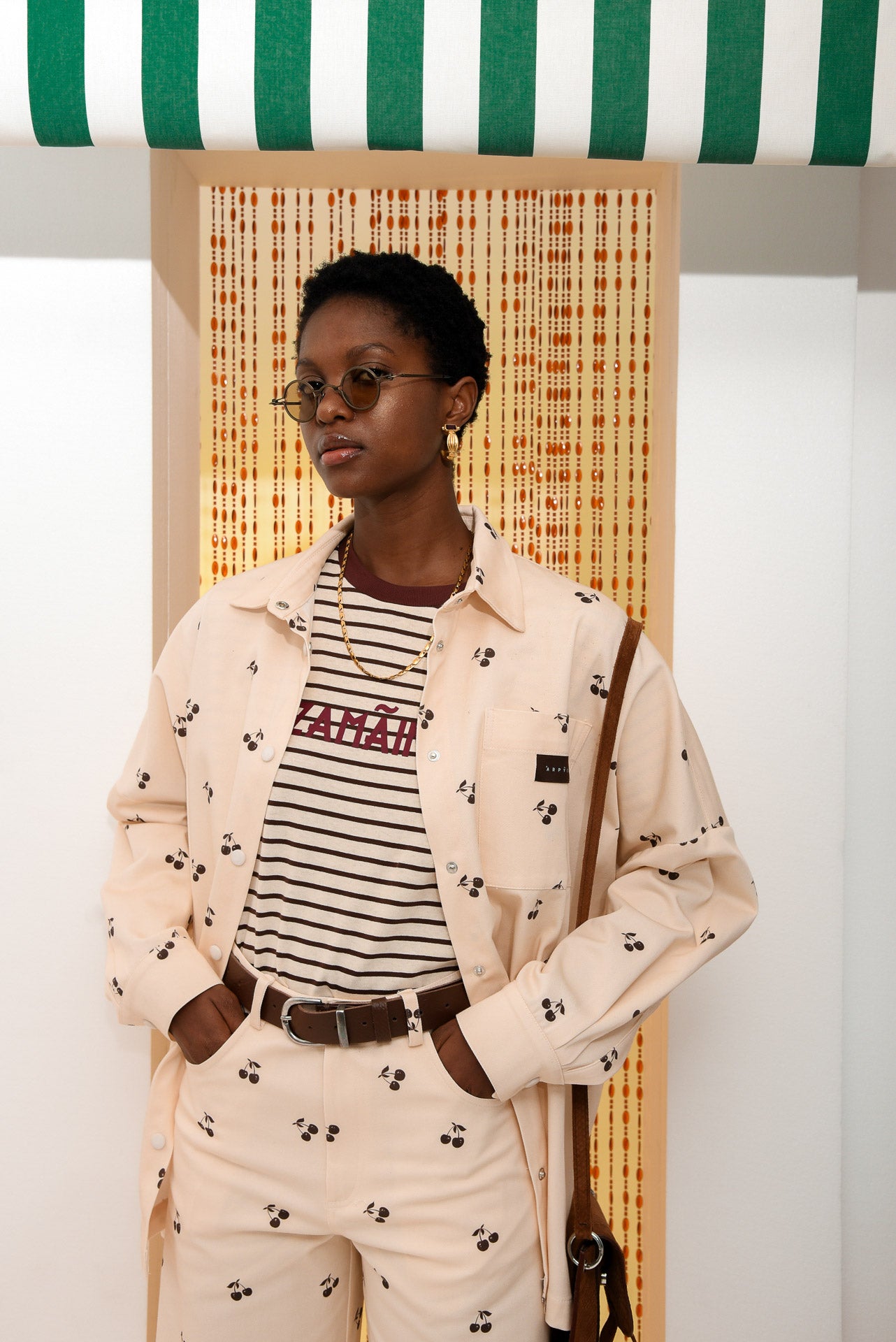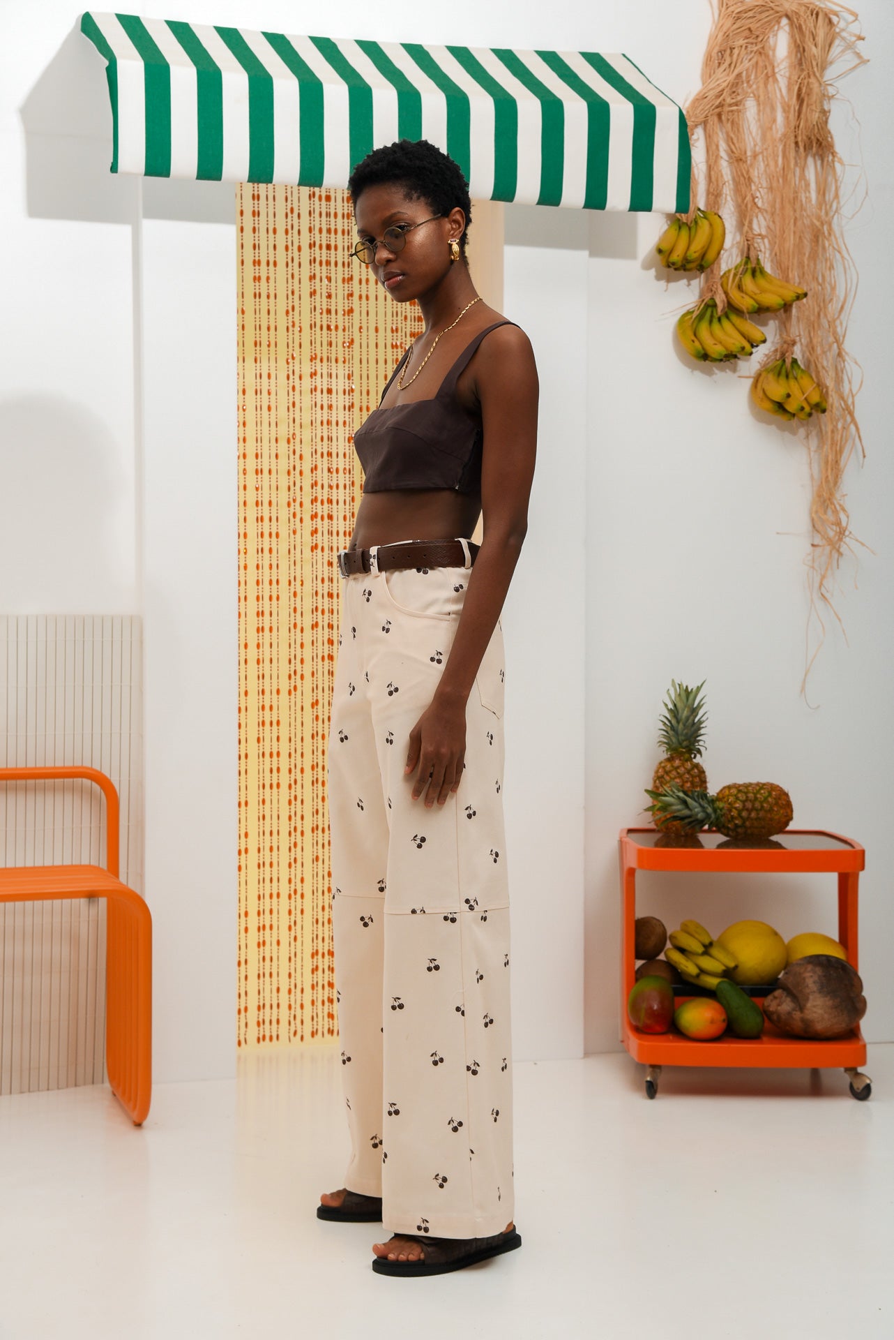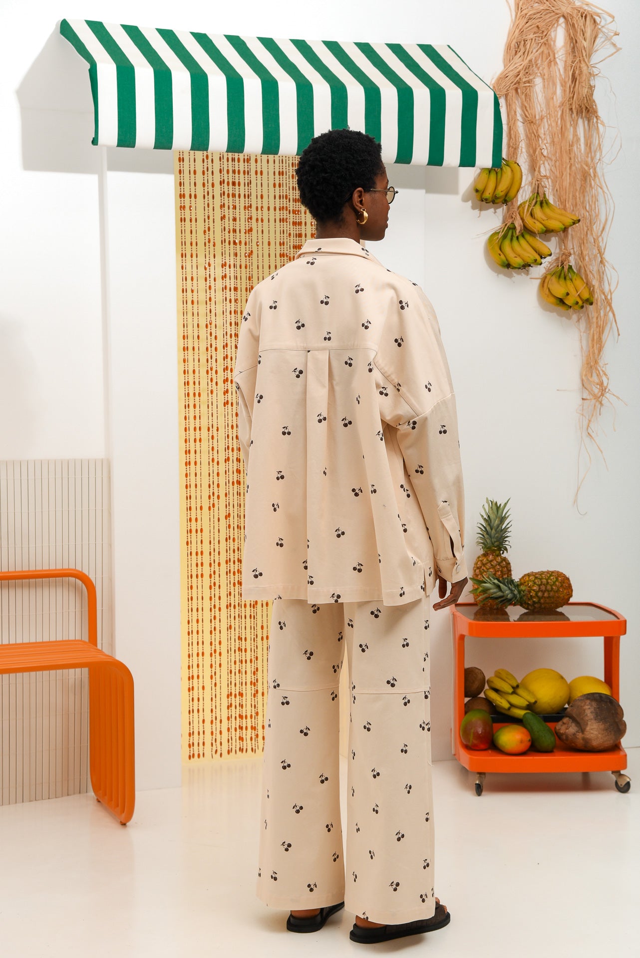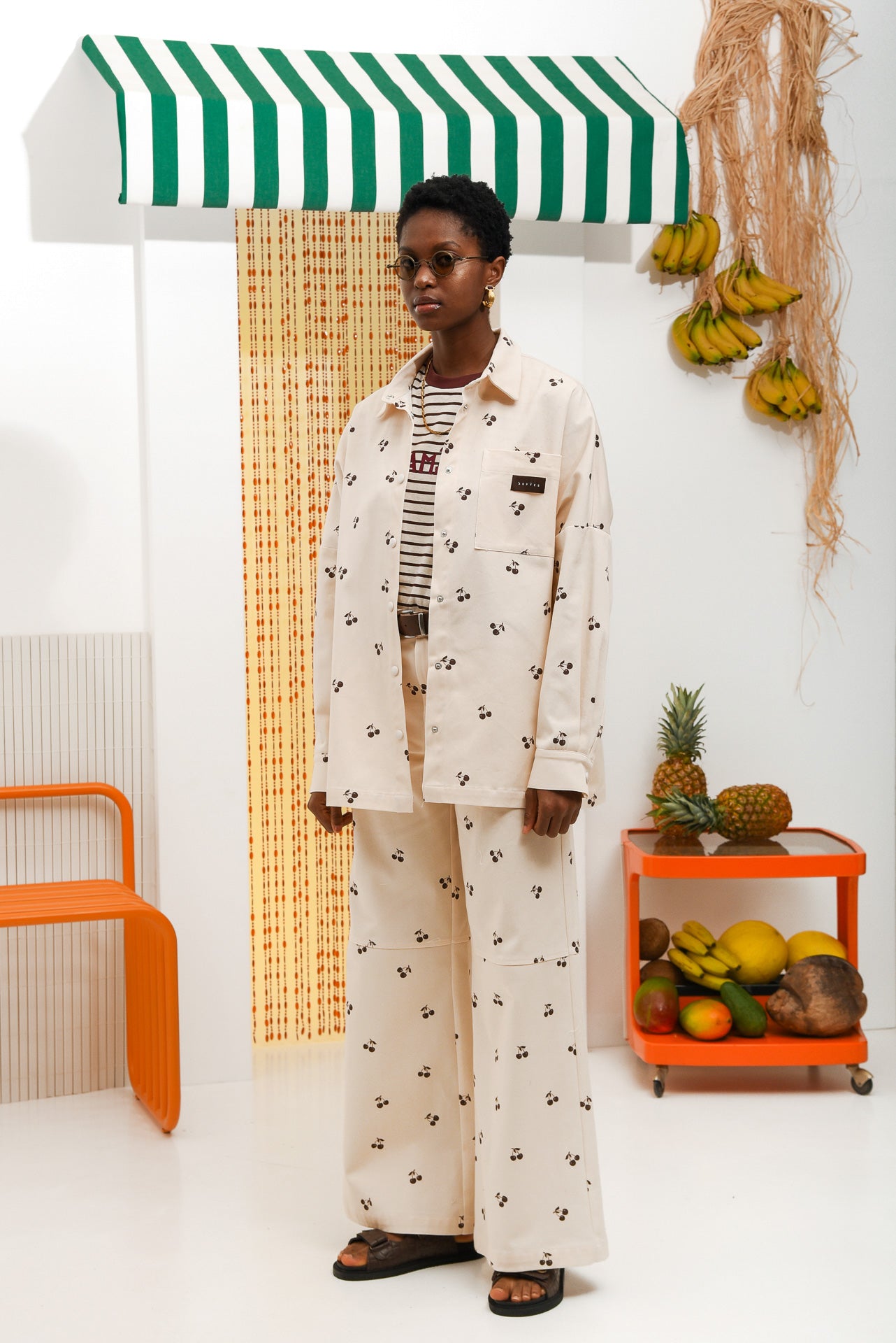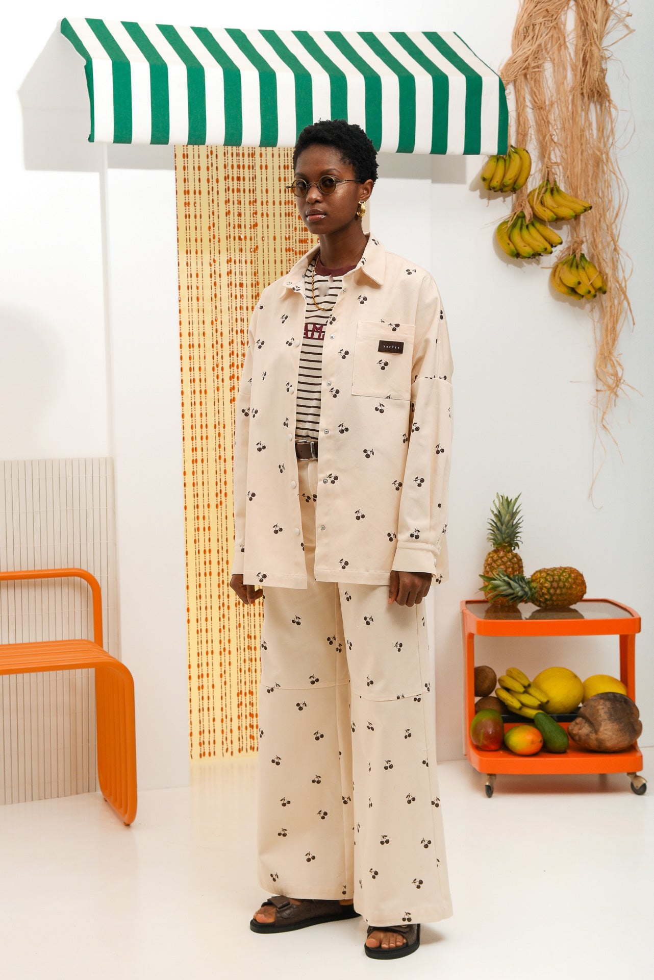 The Cherry Island Pants offer a relaxed, high-waisted fit with a playful cherry print. They feature wide legs, functional pockets, and subtle stitching details and they are made from breathable fabric, perfect for effortless everyday wear.