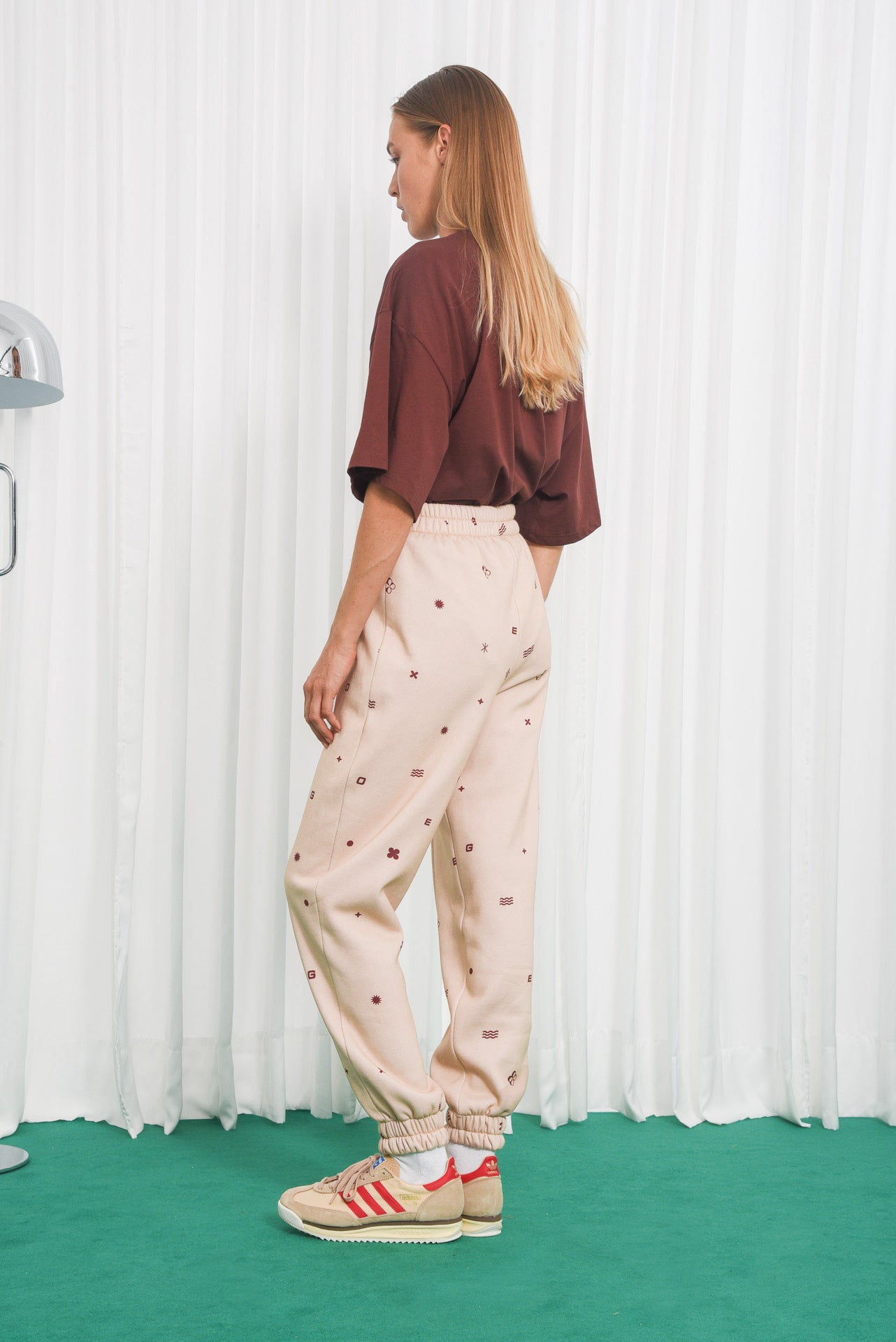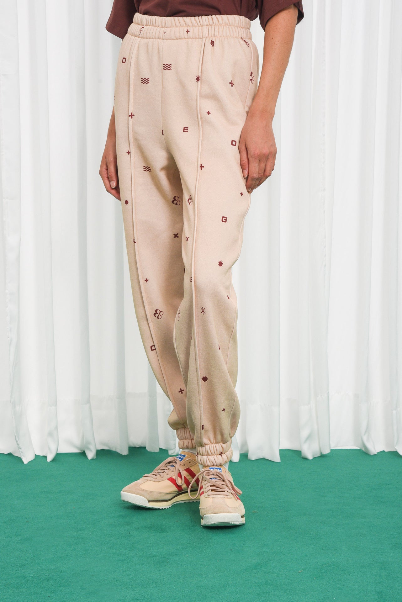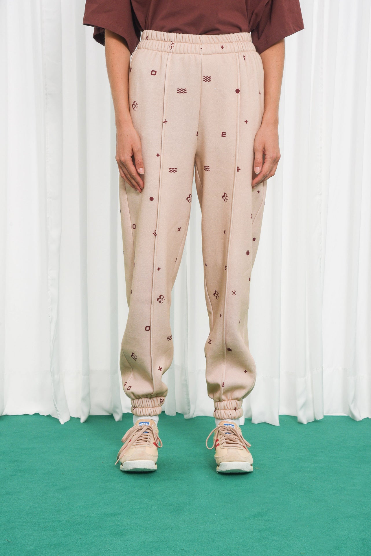 Το παντελόνι Ego είναι φτιαγμένο από μπεζ βαμβακερό ύφασμα με κόκκινα γεωμετρικά μοτίβα. Διαθέτει ψηλή ελαστική μέση, χαλαρή ίσια γραμμή, πλαϊνές τσέπες και ραμμένα πάνελ στα γόνατα που χαρίζουν δομή και στυλ.