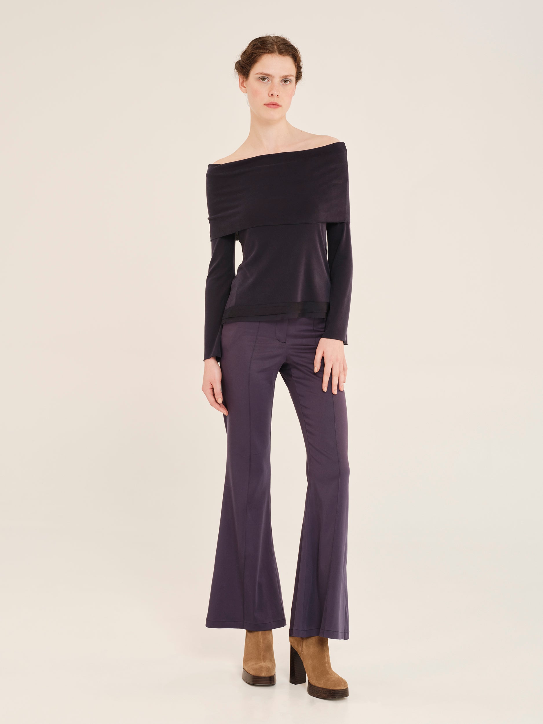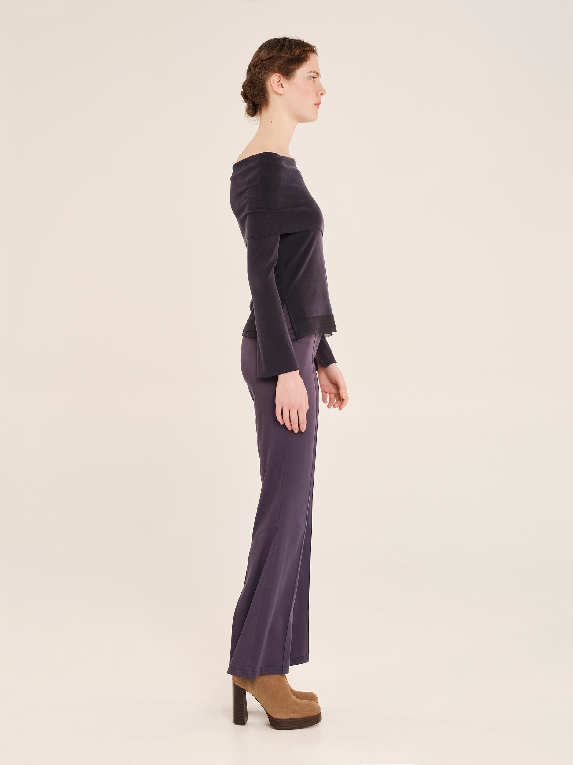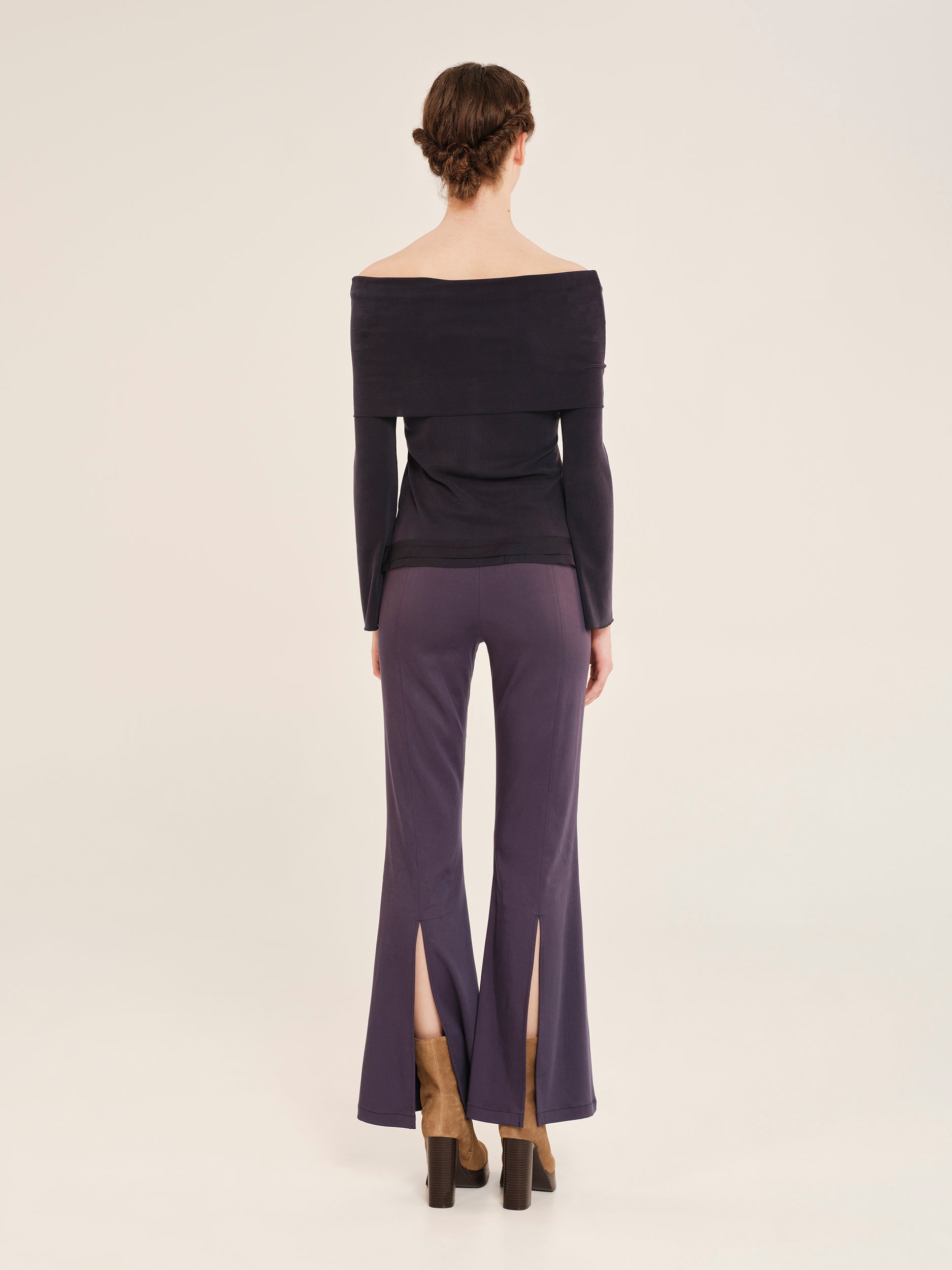 Έξωμη μπλούζα από απαλή ριμπ βισκόζη με λεπτομέρειες από διαφάνεια. Έχει άνετη εφαρμογή που αγκαλιάζει το σώμα ενώ το επάνω μέρος γυρίζει προς τα έξω δημιουργώντας ένα στυλ ξεχειλωτού γιακά που καλύπτει τους ώμους. Τα μανίκια είναι εφαρμοστά με άνοιγμα στο κάτω μέρος προσδίδοντας ένα σαγηνευτικό στοιχείο στο ρούχο. Θηλυκό και παράλληλα πρακτικό, αποτελεί ένα μοναδικό κομμάτι για εμφανίσεις από το πρωί ως το βράδυ.