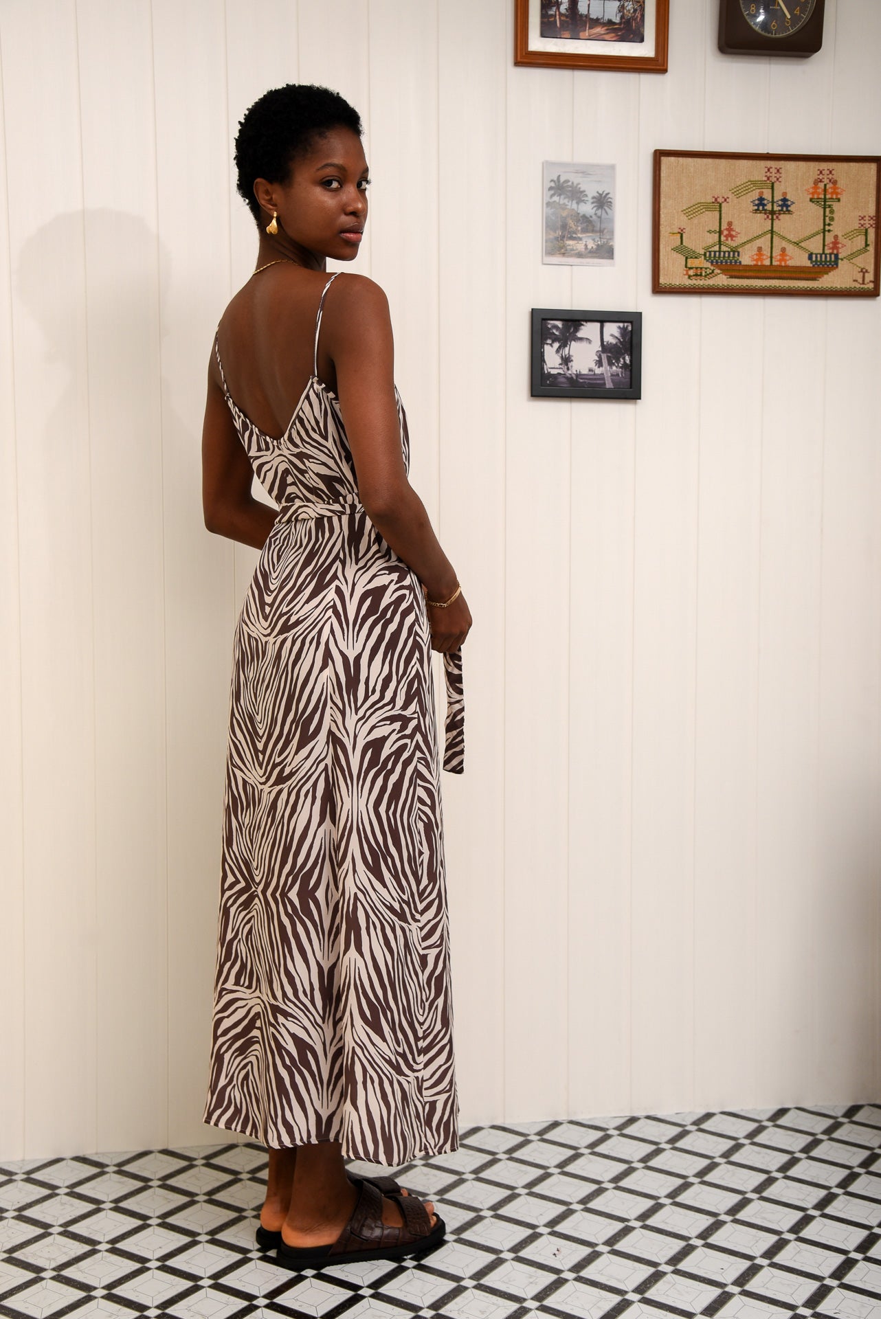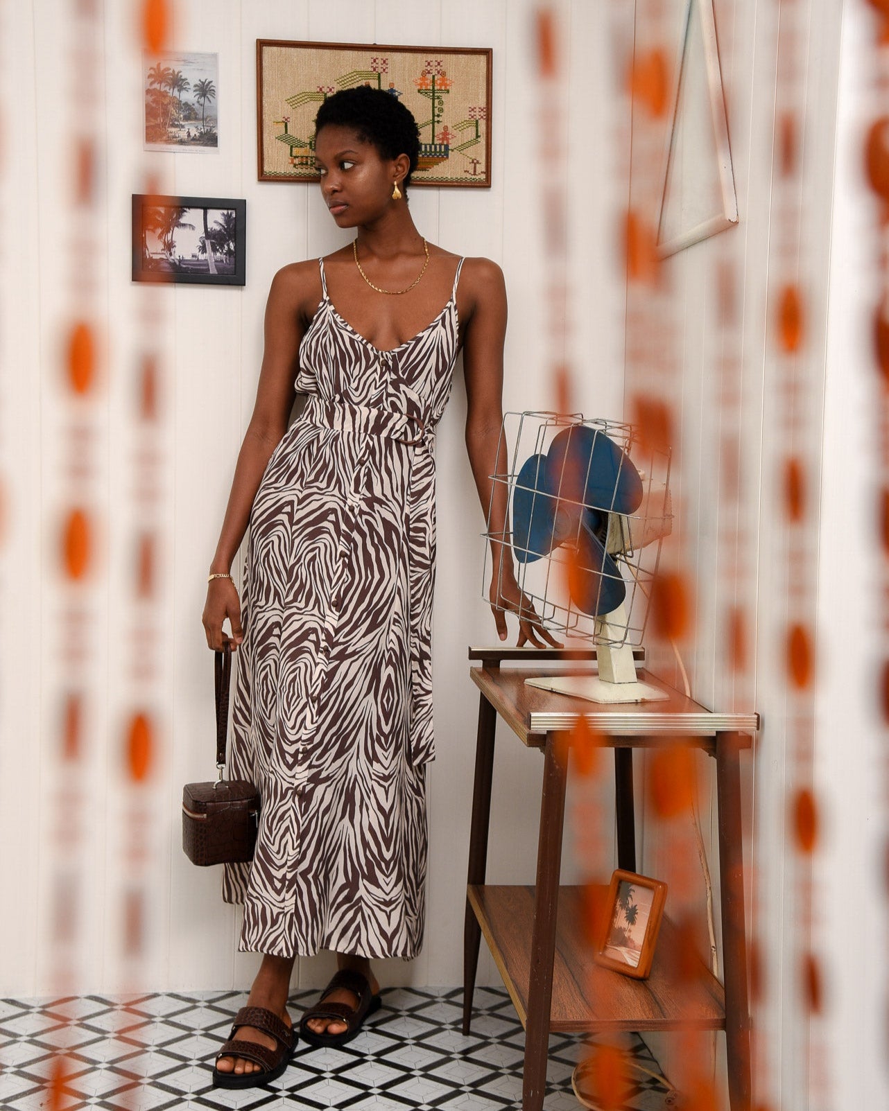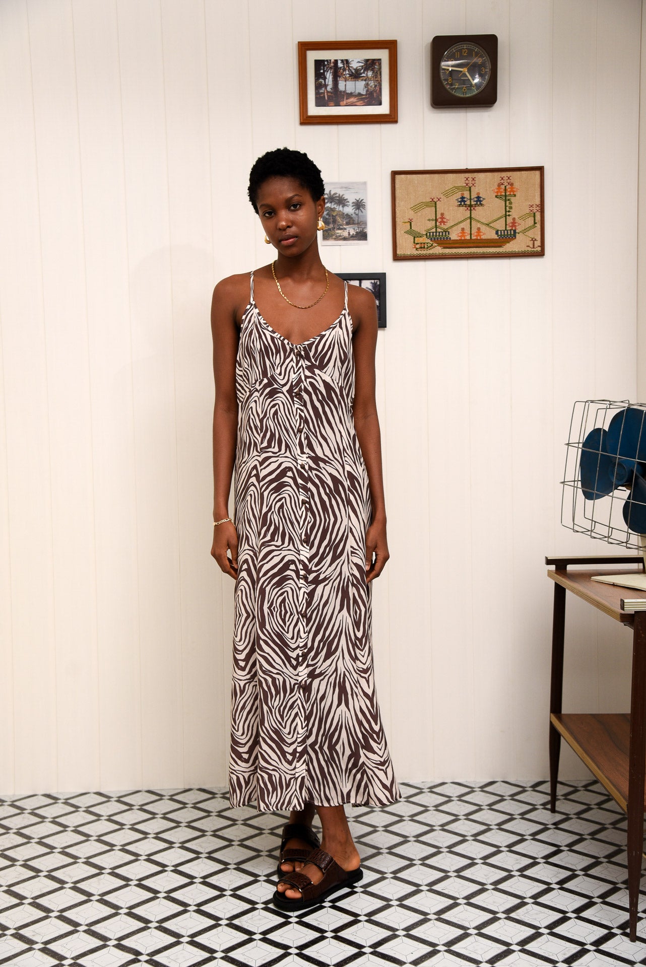 The Pepper Pot Dress is a sleeveless, midi-length dress with a soft zebra print. It has thin adjustable straps, a deep V-neck, buttons all the way down the front, and a matching belt with a round buckle to tie at the waist. Made from lightweight, breathable fabric—it’s perfect for warm days.