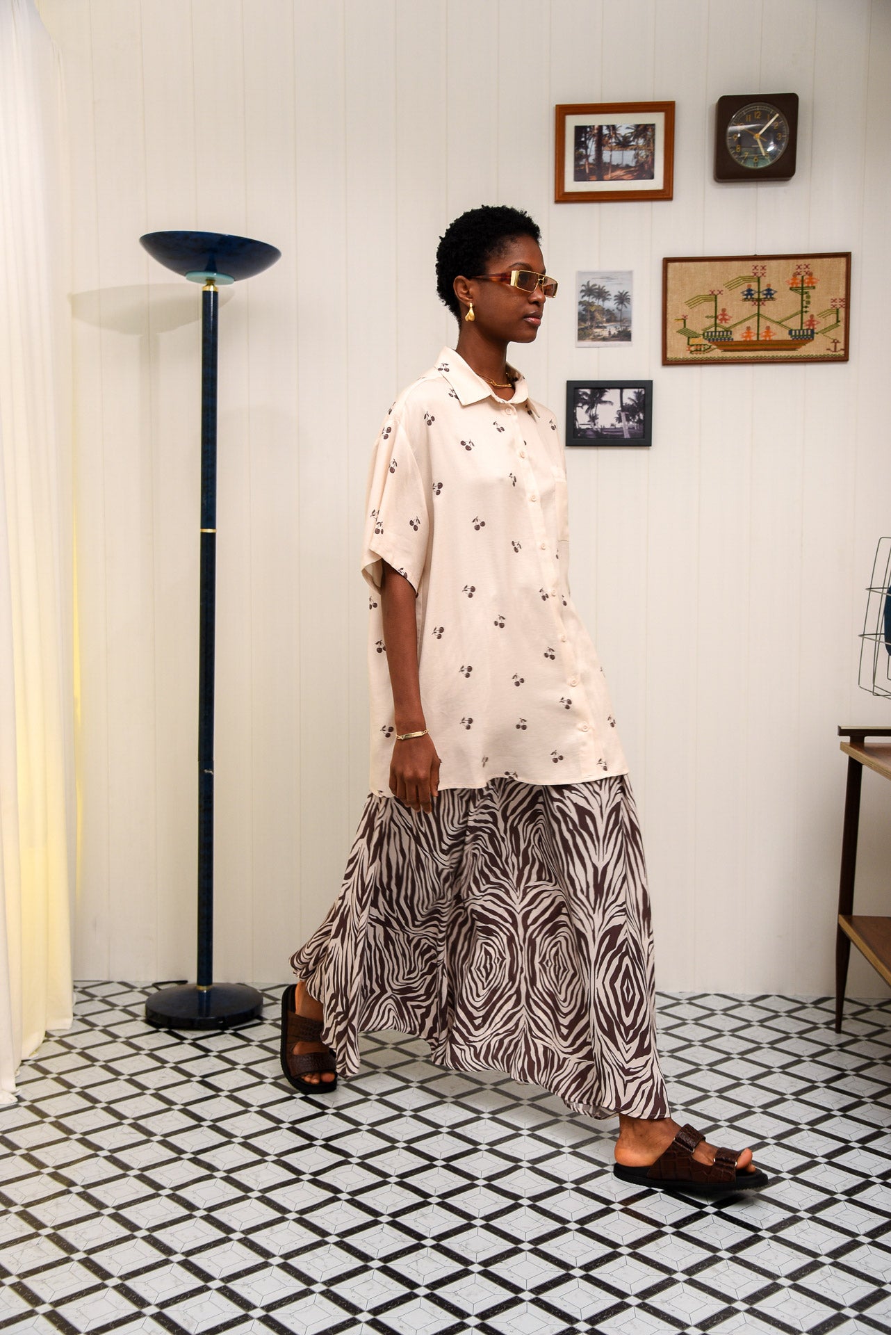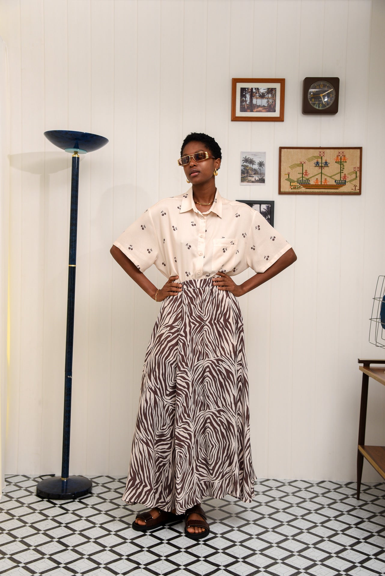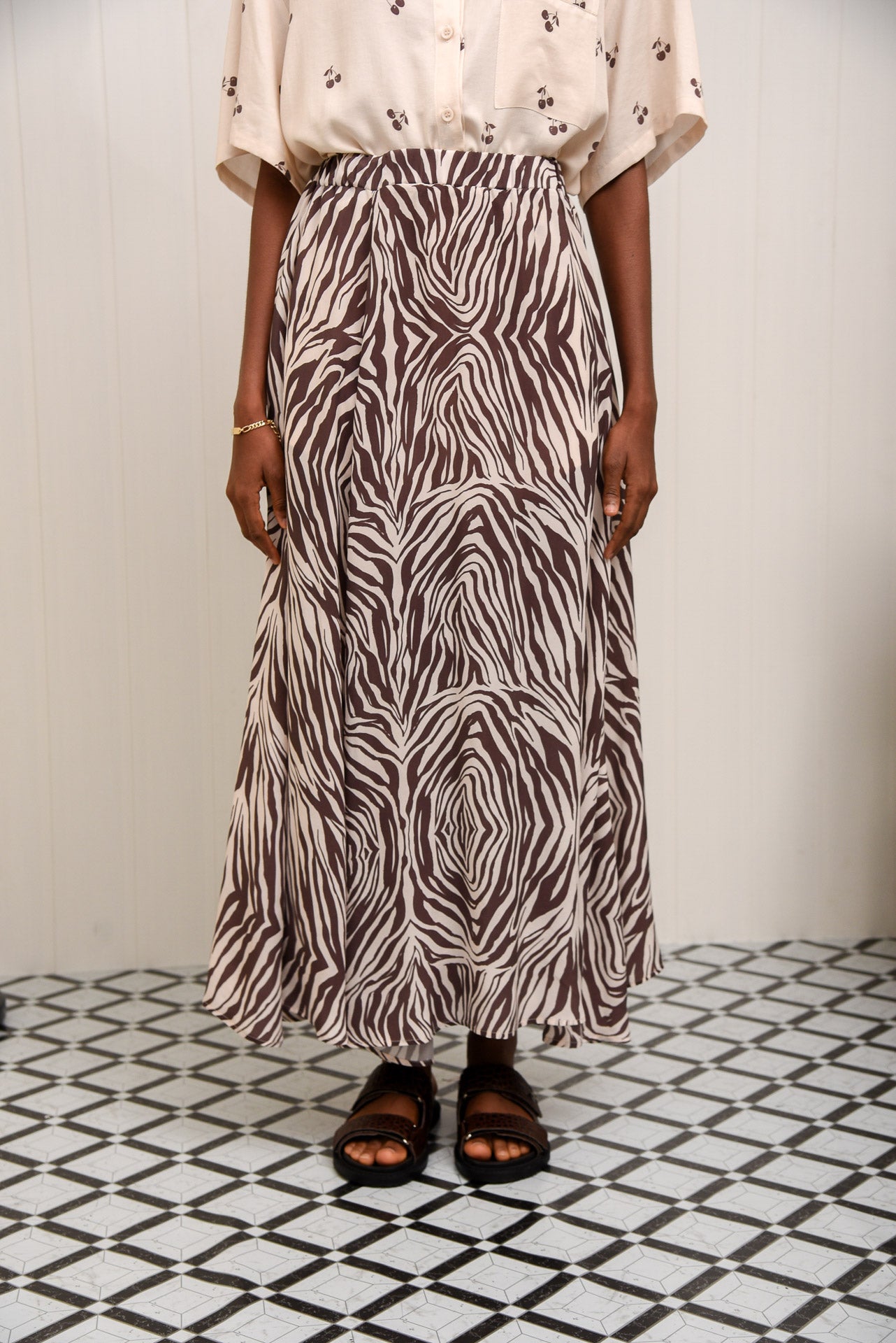 Pepper pot is a midi-length, flowy skirt with an elastic waistband for a comfy, easy fit. Made from soft, breathable fabric in a bold brown and cream zebra print. Lightweight and unlined, it moves beautifully with every step. Easy to style up or down—perfect with matching prints or simple tops for a relaxed statement look.