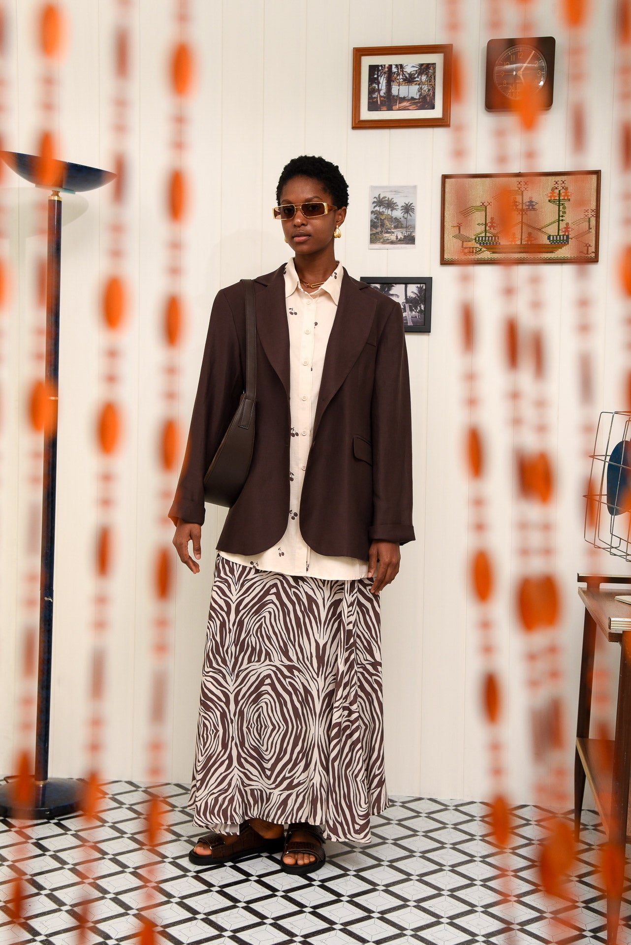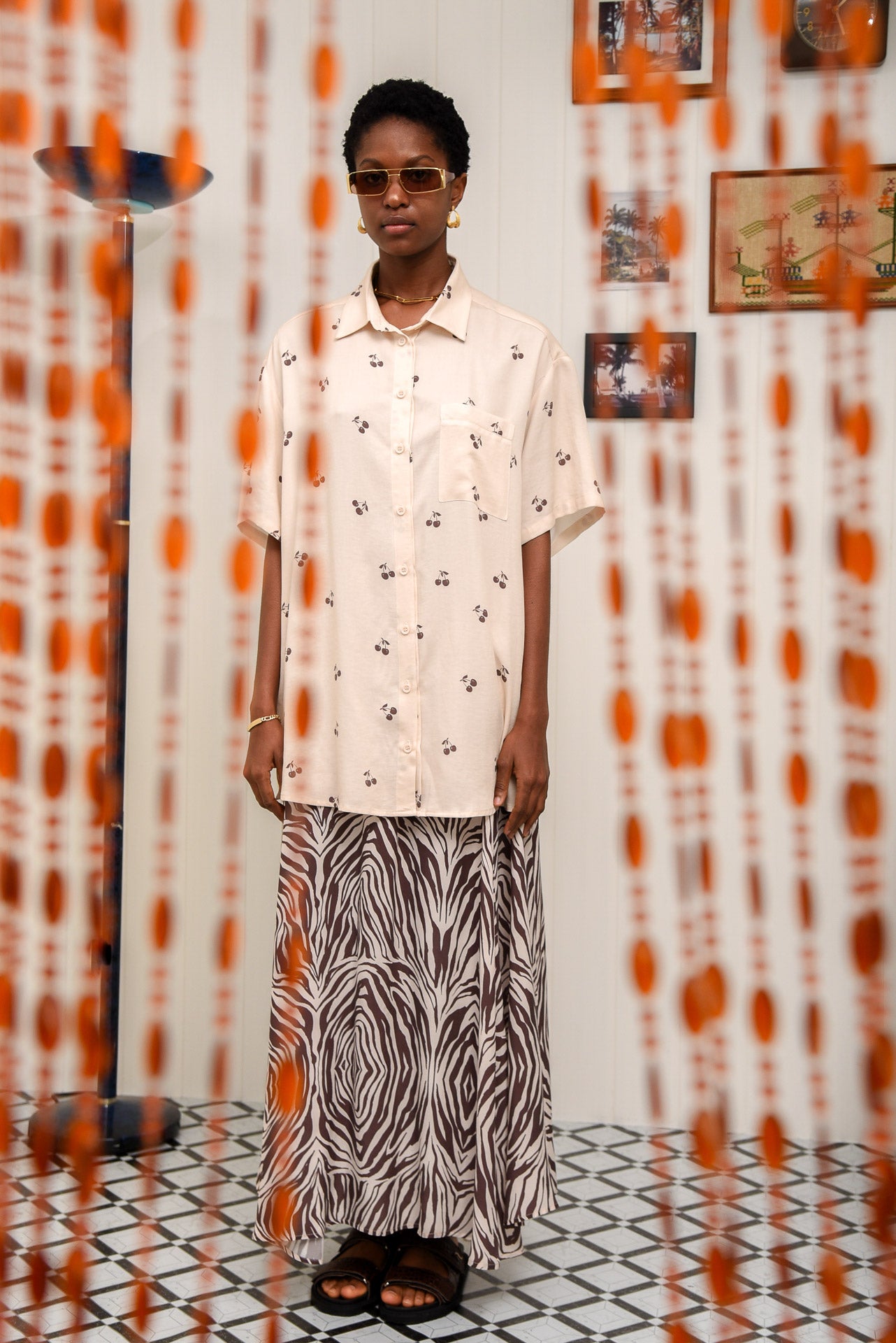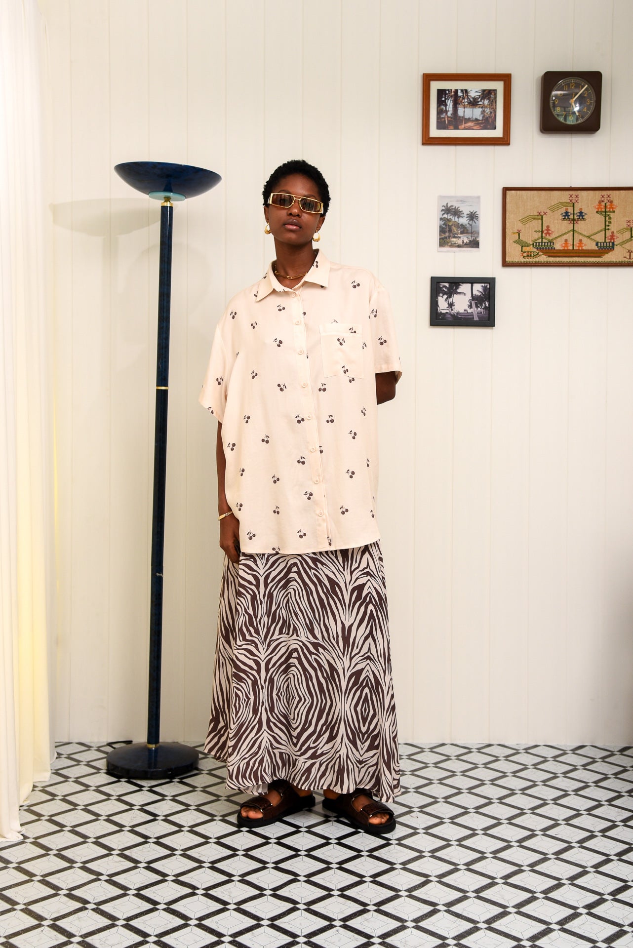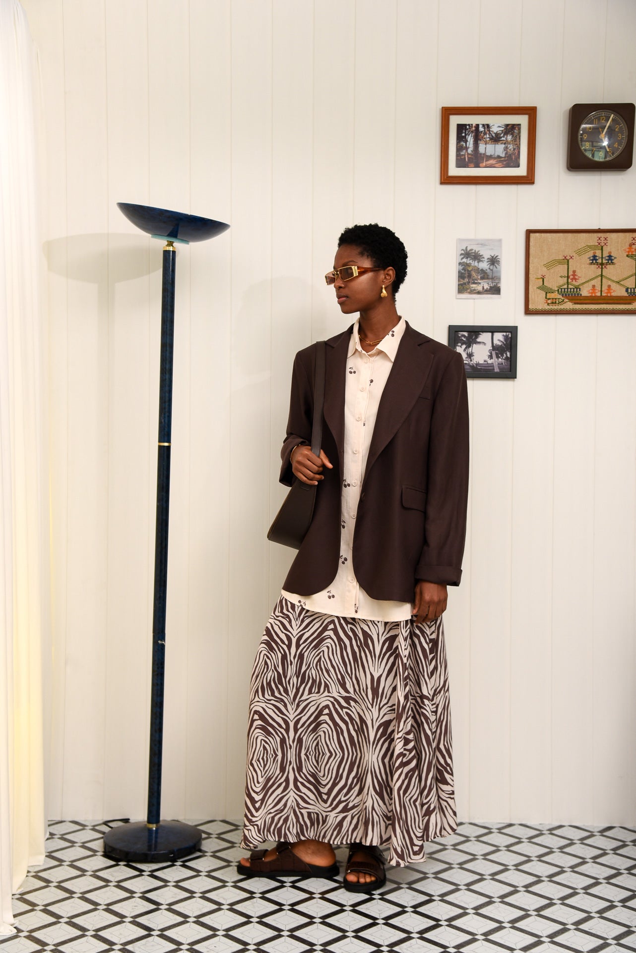 Pepper pot is a midi-length, flowy skirt with an elastic waistband for a comfy, easy fit. Made from soft, breathable fabric in a bold brown and cream zebra print. Lightweight and unlined, it moves beautifully with every step. Easy to style up or down—perfect with matching prints or simple tops for a relaxed statement look.