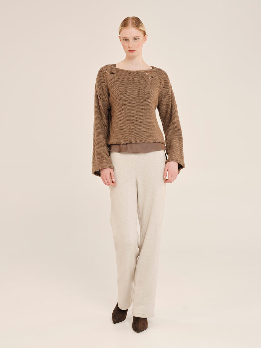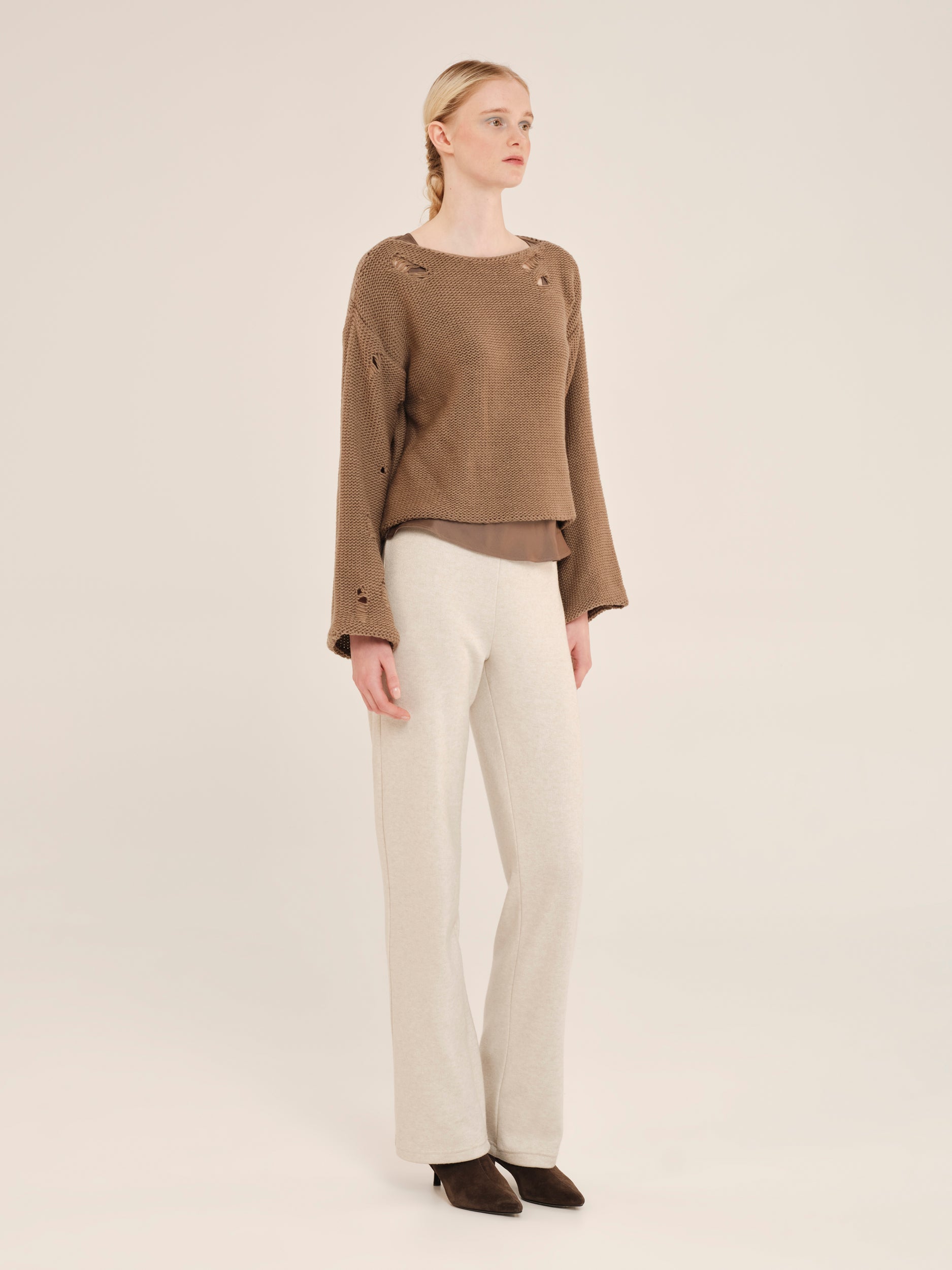 Πλεκτή cropped μπλούζα από σύμμικτο μαλλί με χουχουλιάρικη υφή. Διαθέτει χαλαρή εφαρμογή που αγκαλιάζει απαλά το σώμα και τα χέρια. Το κοντό μήκος, τα φαρδιά μανίκια και η ιδιαίτερη, διάτρητη πλέξη της προσδίδουν νεανικό και σύγχρονο χαρακτήρα.