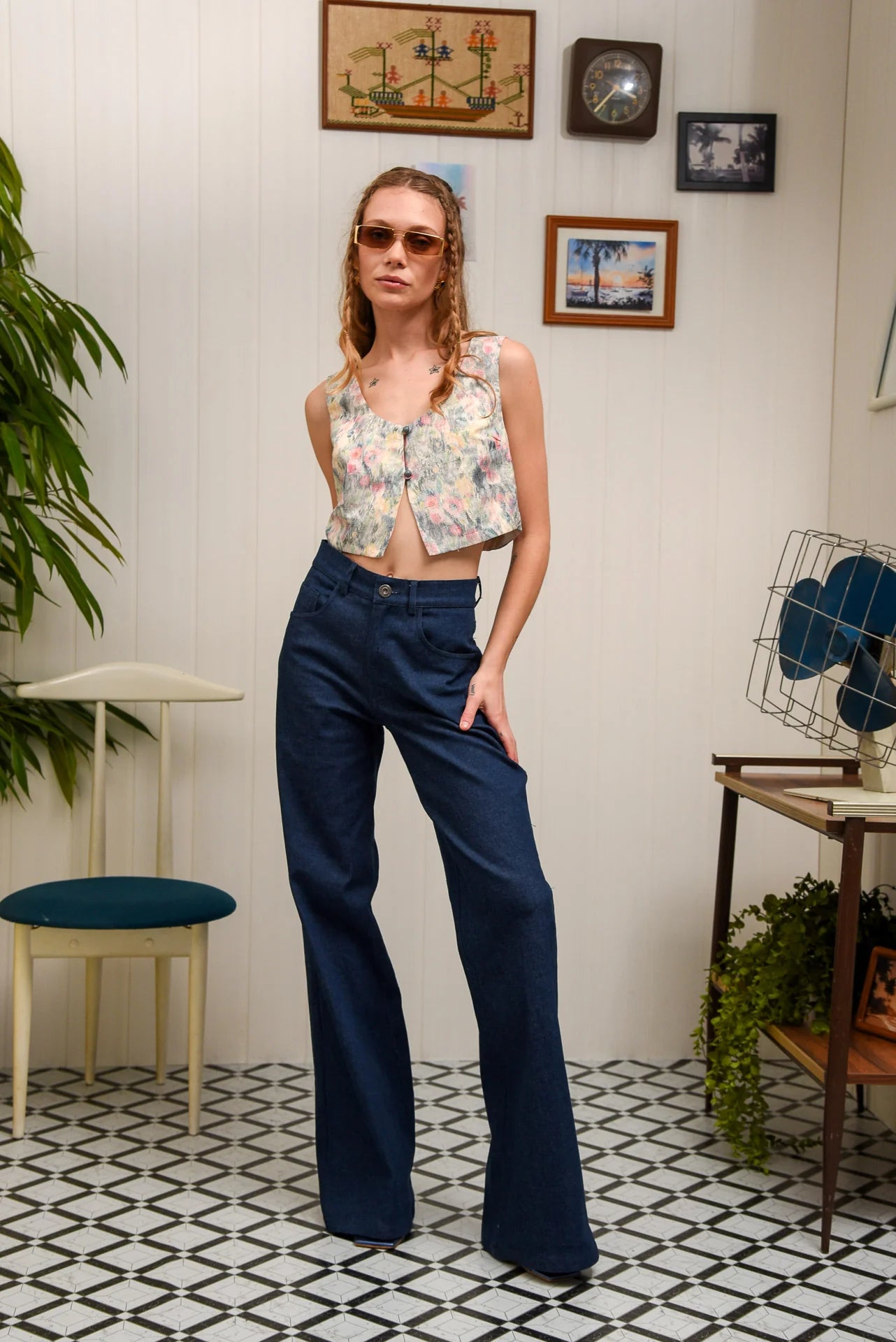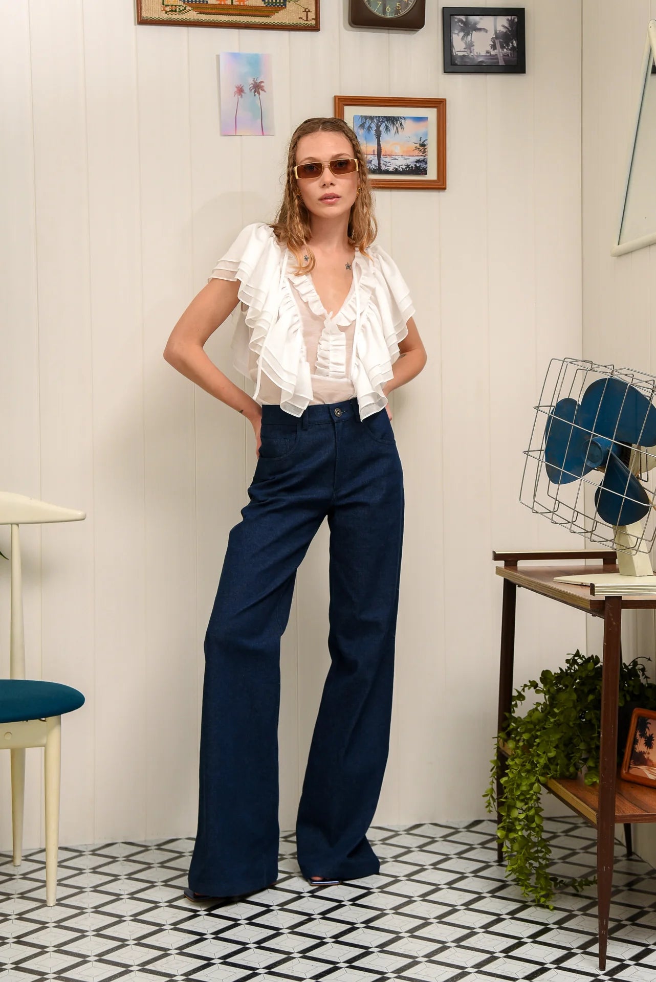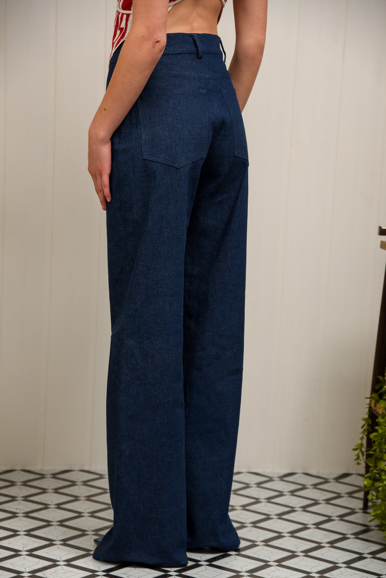 The Tamarind pants offer a high-waisted, wide-leg silhouette for effortless style and comfort. Made from soft, lightweight denim in a blue wash, they feature classic five-pocket styling and a button-zip closure. Perfect for everyday wear, these versatile pants add a relaxed yet refined touch to any outfit.