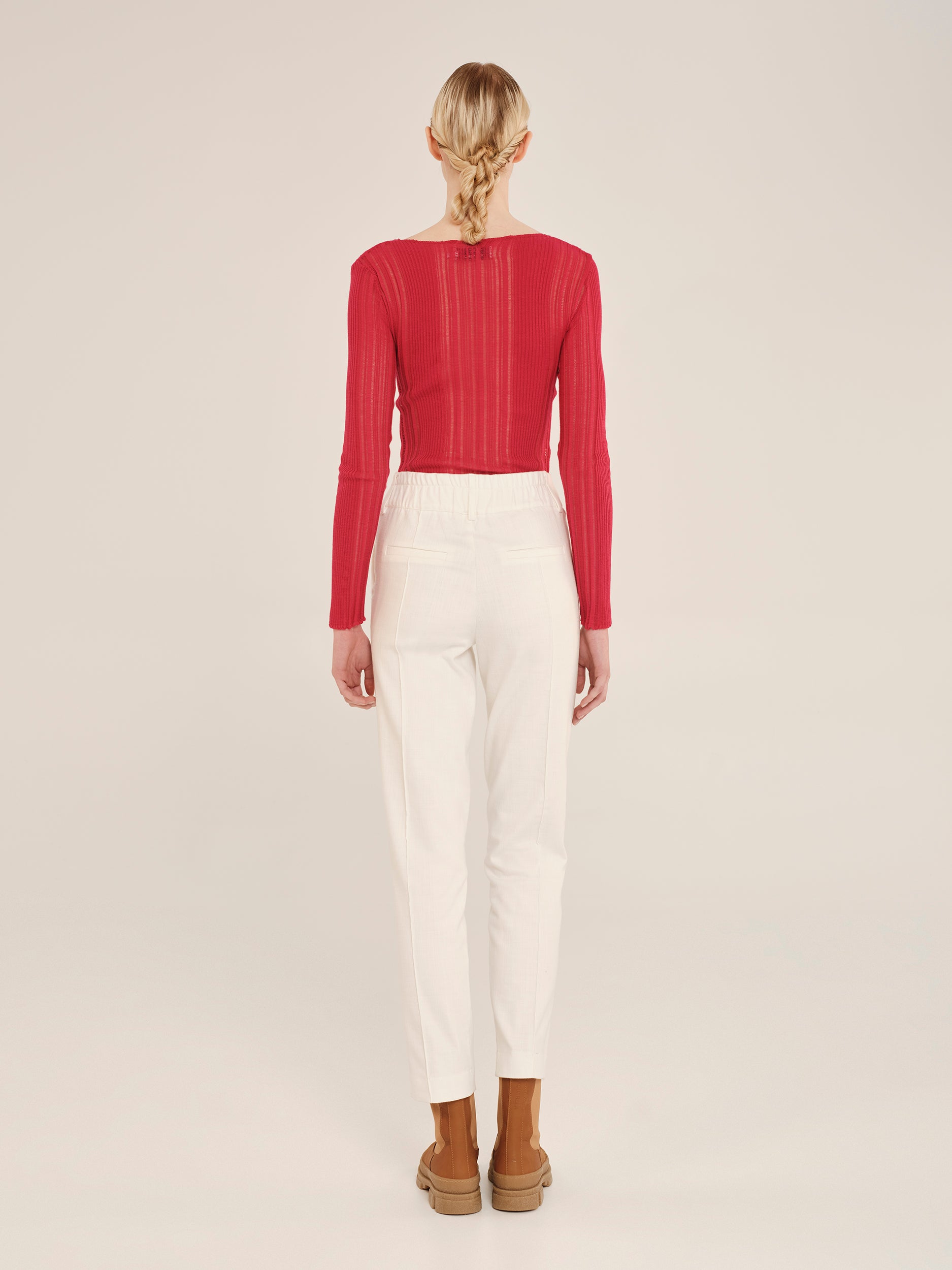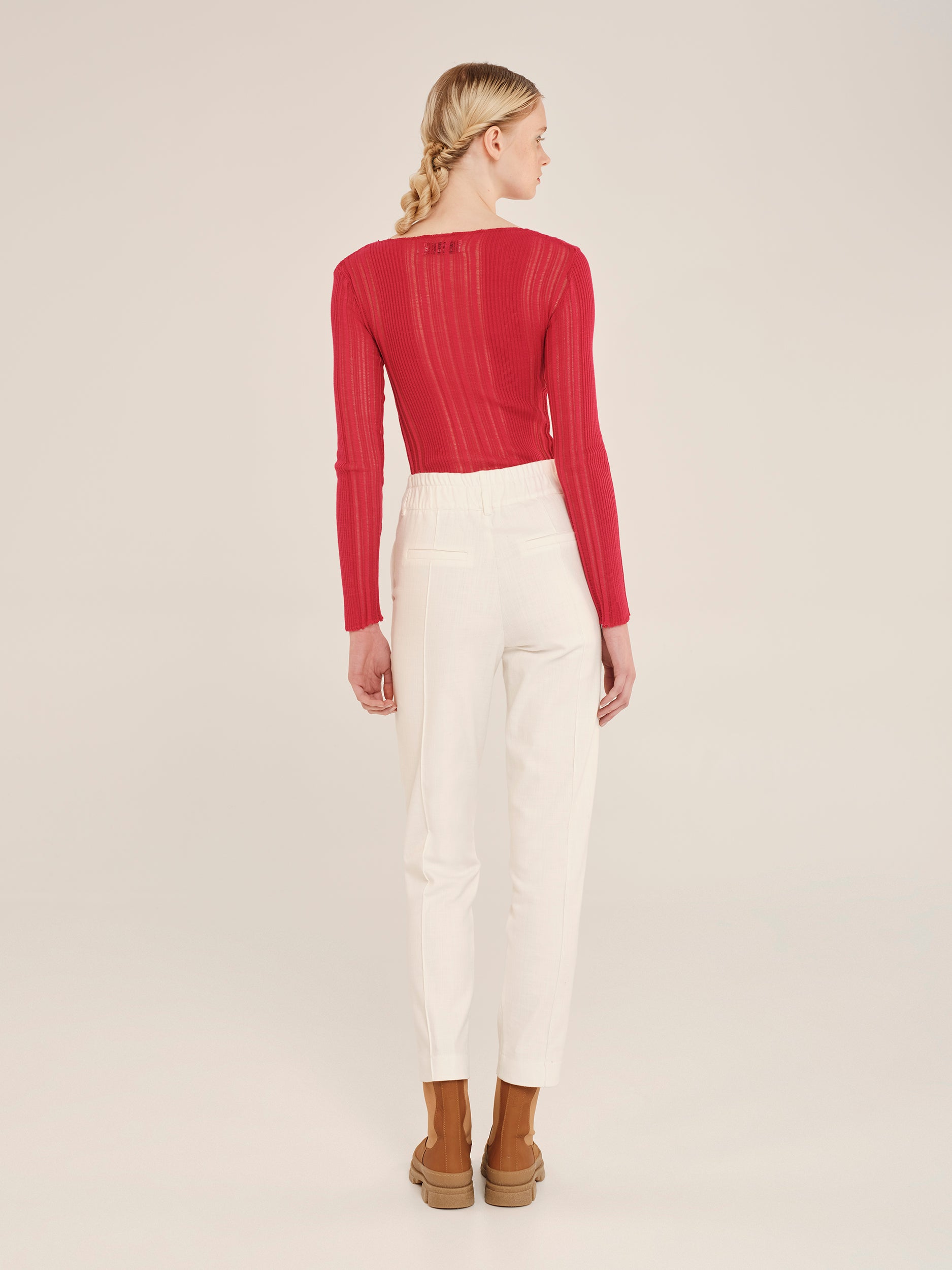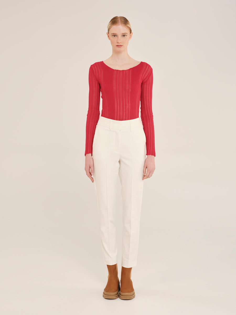 Πλεκτό μακρυμάνικο τοπ με στρογγυλή λαιμόκοψη από 100% ελληνικό βαμβάκι. Έχει μακριά μανίκια και εφαρμογή που αγκαλιάζει τη σιλουέτα ενώ φέρει την χαρακτηριστική διάτρητη πλέξη της γκάμας “Archetypes” στη χειμερινή εκδοχή της. Ένα άκρως θηλυκό σχέδιο που αναδεικνύει κάθε look ενώ συνδυάζεται ιδανικά με τα κάτω μέρη της συλλογής.