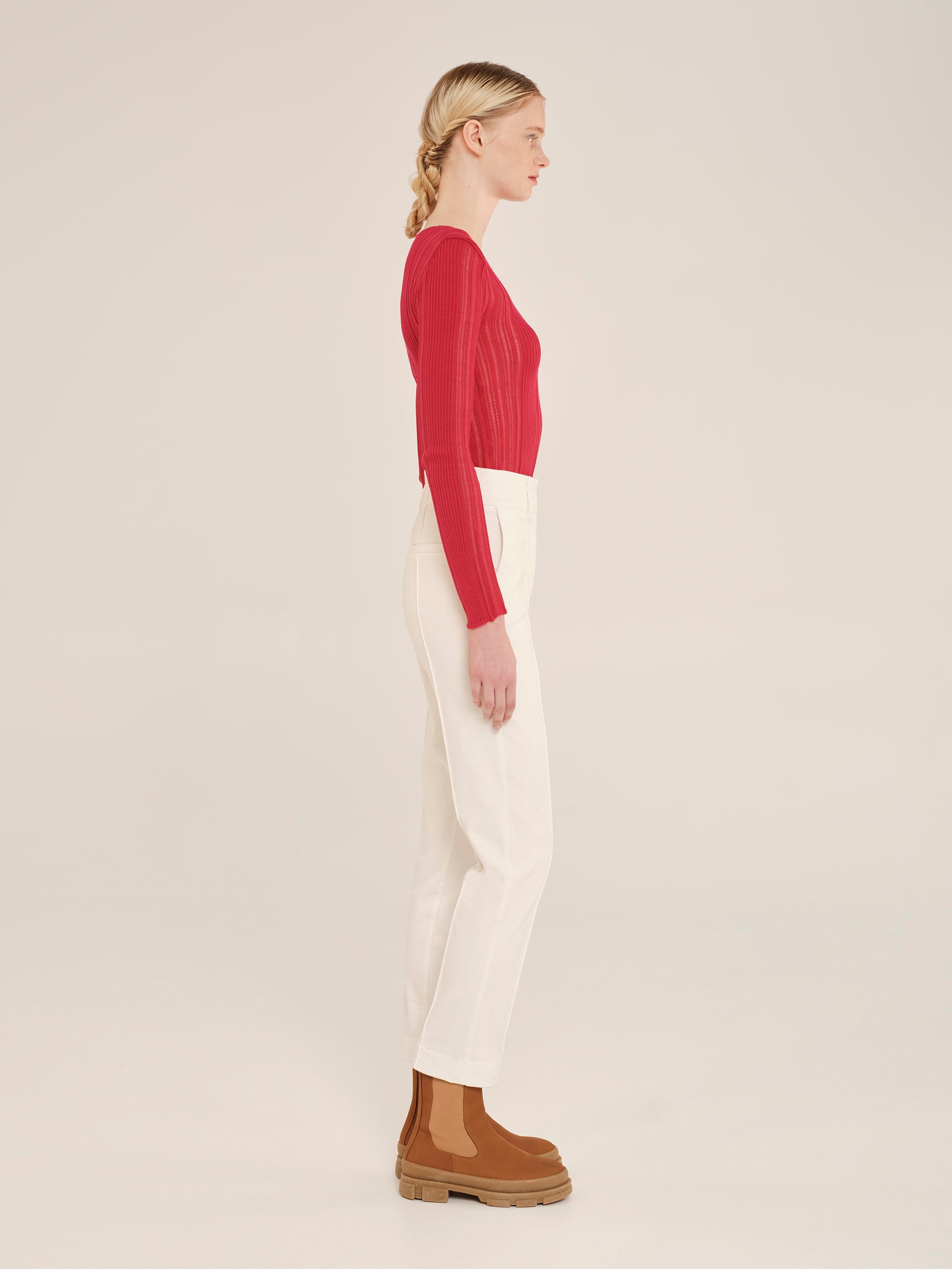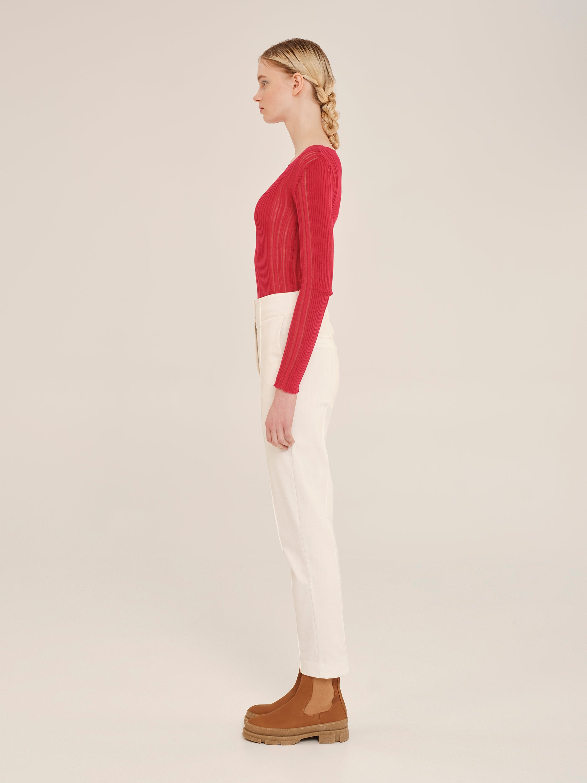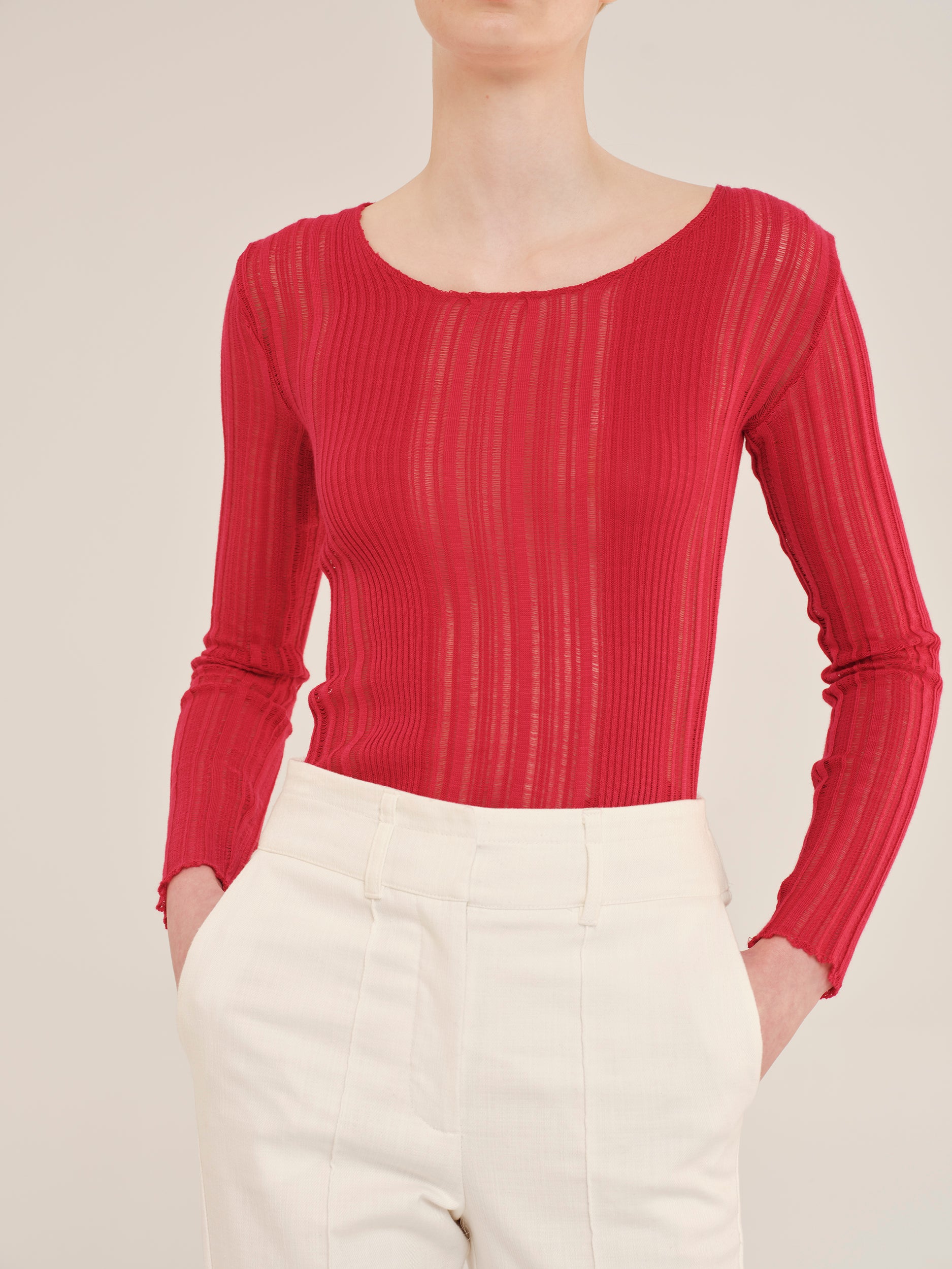 Πλεκτό μακρυμάνικο τοπ με στρογγυλή λαιμόκοψη από 100% ελληνικό βαμβάκι. Έχει μακριά μανίκια και εφαρμογή που αγκαλιάζει τη σιλουέτα ενώ φέρει την χαρακτηριστική διάτρητη πλέξη της γκάμας “Archetypes” στη χειμερινή εκδοχή της. Ένα άκρως θηλυκό σχέδιο που αναδεικνύει κάθε look ενώ συνδυάζεται ιδανικά με τα κάτω μέρη της συλλογής.