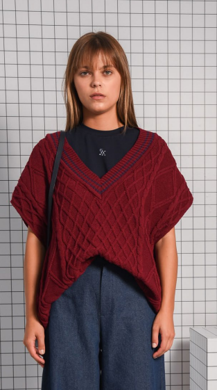 The “Branch Out” vest is crafted in an oversized, relaxed fit. Its textured cable-knit pattern and deep V-neck create a striking layered look. The ribbed trim with contrasting stripes adds a stylish edge, making it perfect for pairing over a tee or blouse. This cozy yet bold vest is an ideal statement piece for any wardrobe.