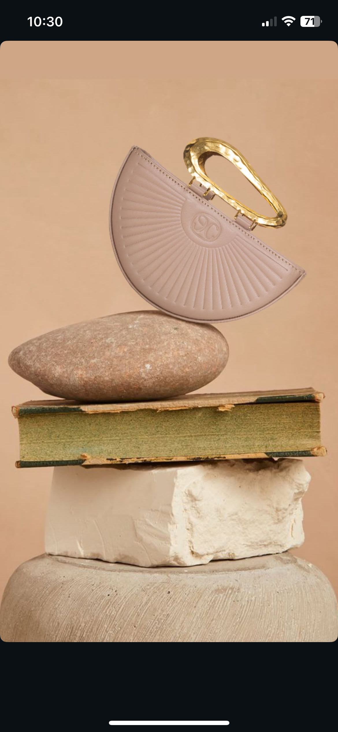 It features a unique sunray pattern and a bold hammerd gold handle, that makes it perfect for both day and evening looks.