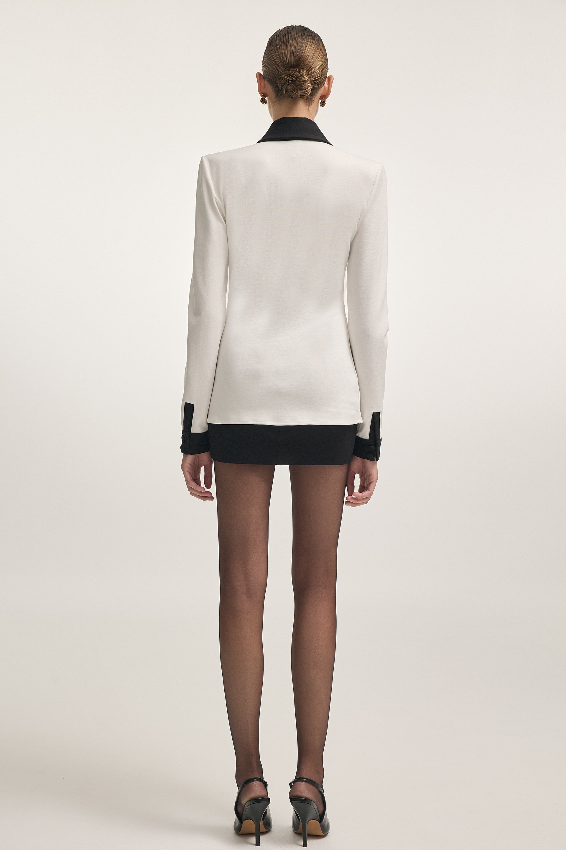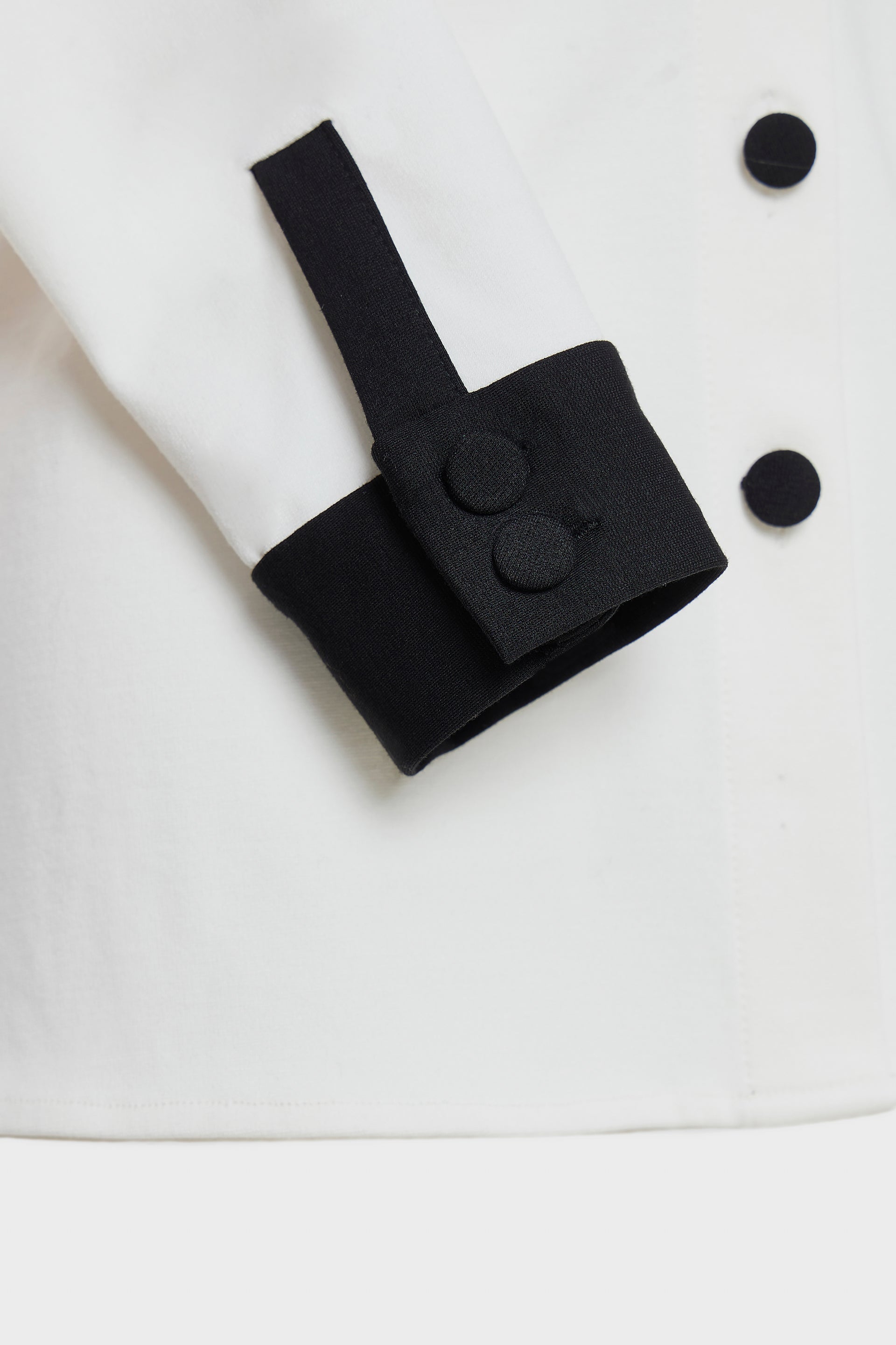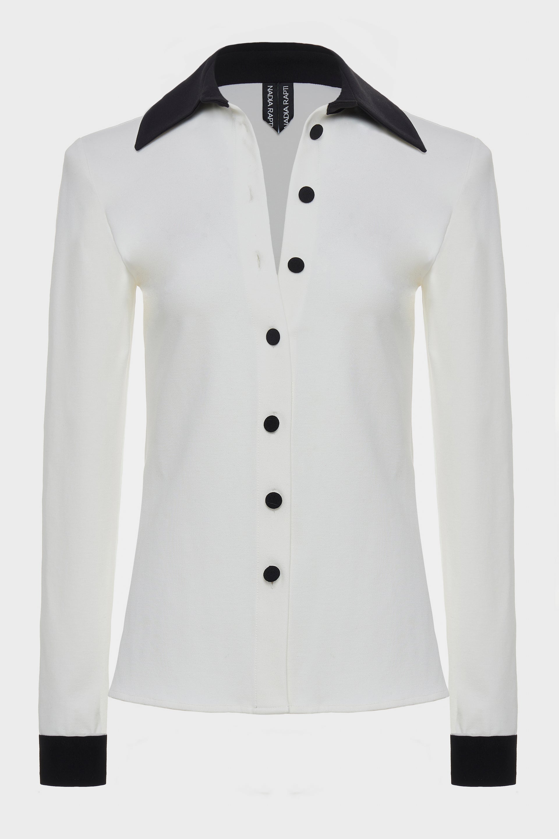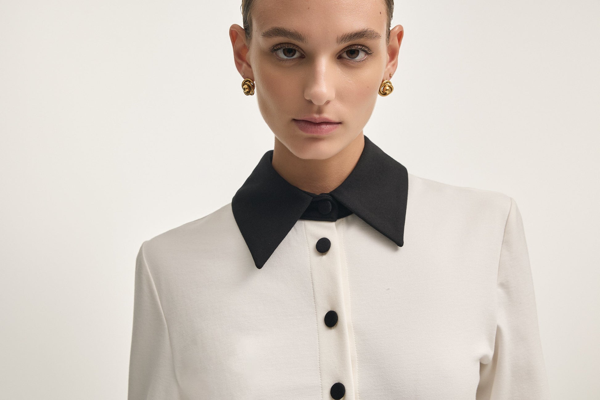 Dramatic Contrast. White canvas with inky borders. This shirt bears the structured, powerful shoulders of the '80s, framed by the stark black collar and cuffs. It is an ode to refined drama, a dance between light and shadow.