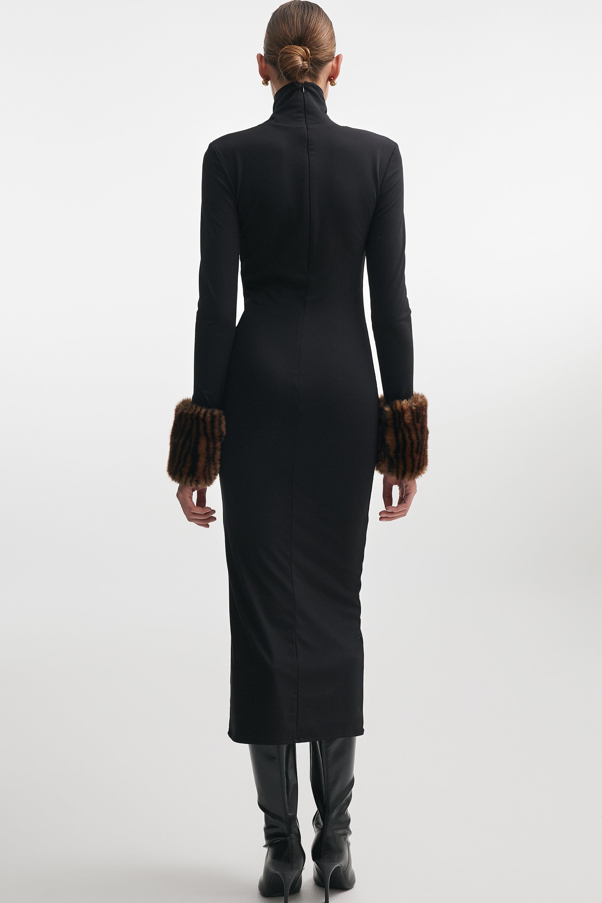 Fran is the ultimate midi dress that instantly elevates your look. With a slim silhouette, long sleeves and a high collar. Designed with luxurious faux-fur cuffs that add texture and a bold detail. The fitted shape enhances the figure, making it perfect for evening events or special occasions.