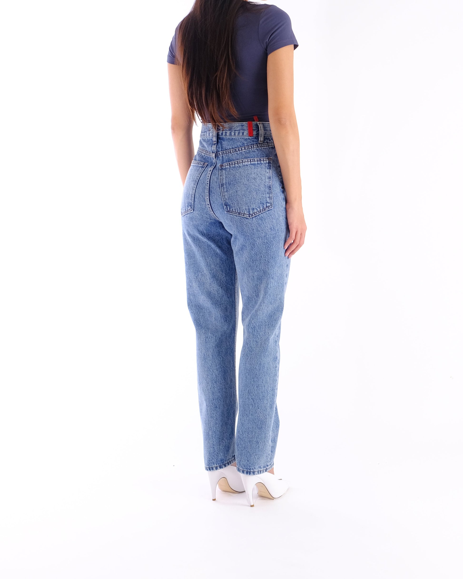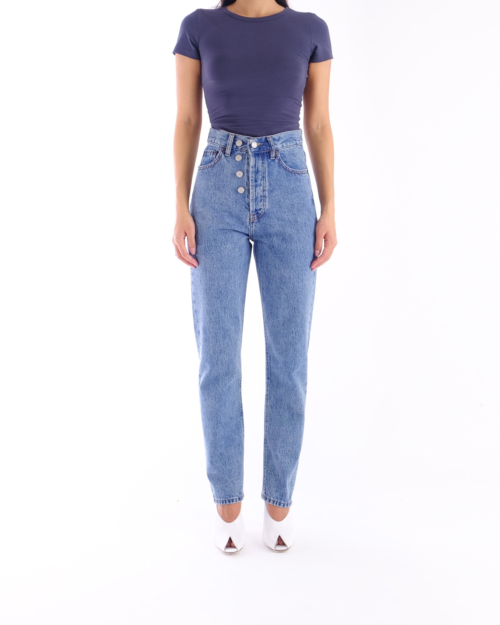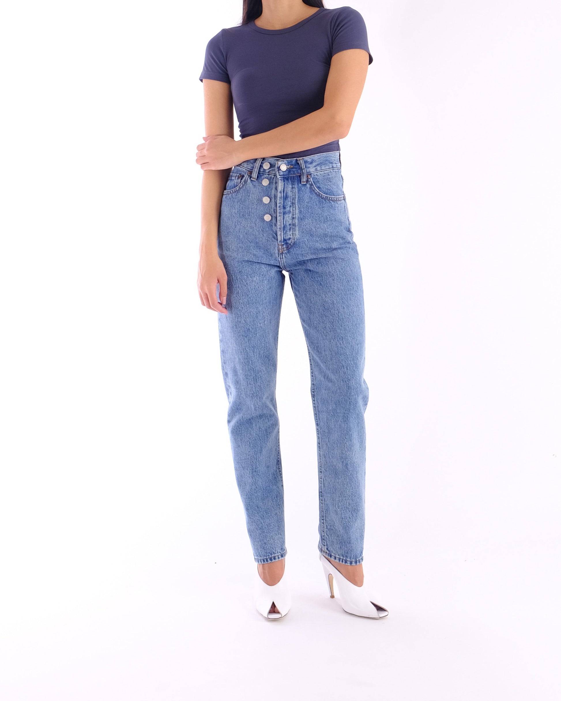 Gia pants are going to be your all-year-round most favourite piece. They're designed in straight-leg fit with discrete exposed buttons and in classic blue stone wash. They have a high-rise waist and cropped ankle hem. The coolest way to wear them is with a plain t-shirt or a shirt, minimal jewellery and the pair of shoes you feel like wearing.