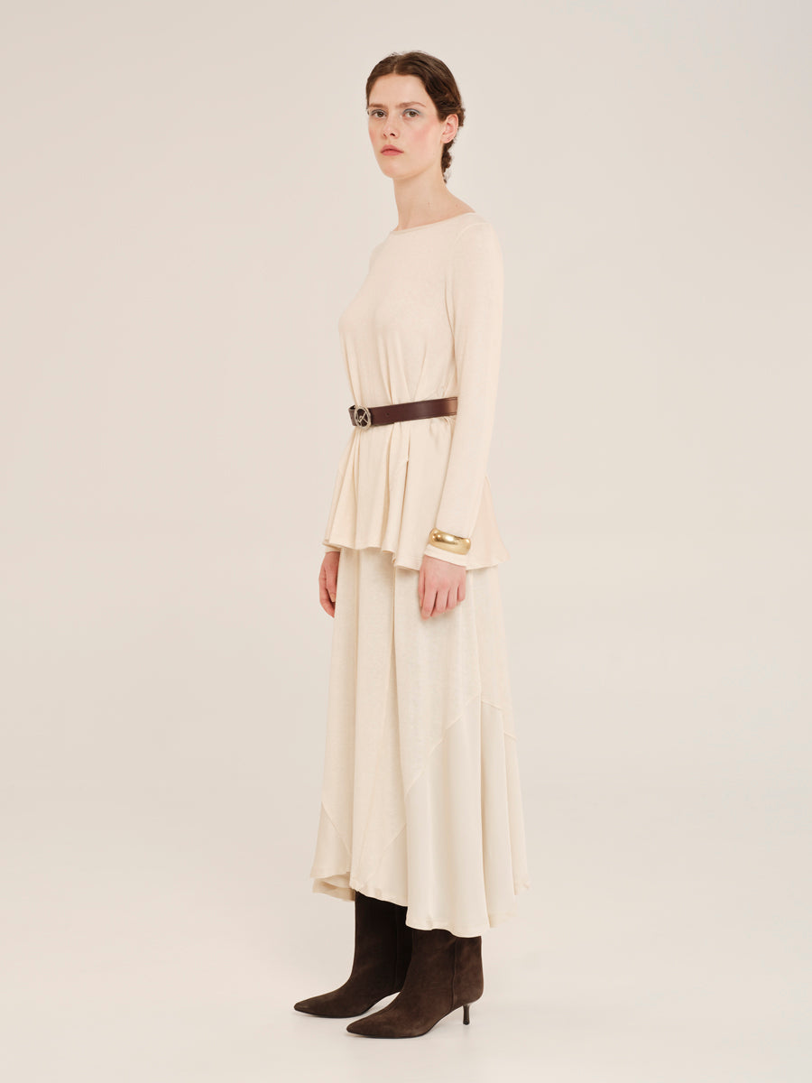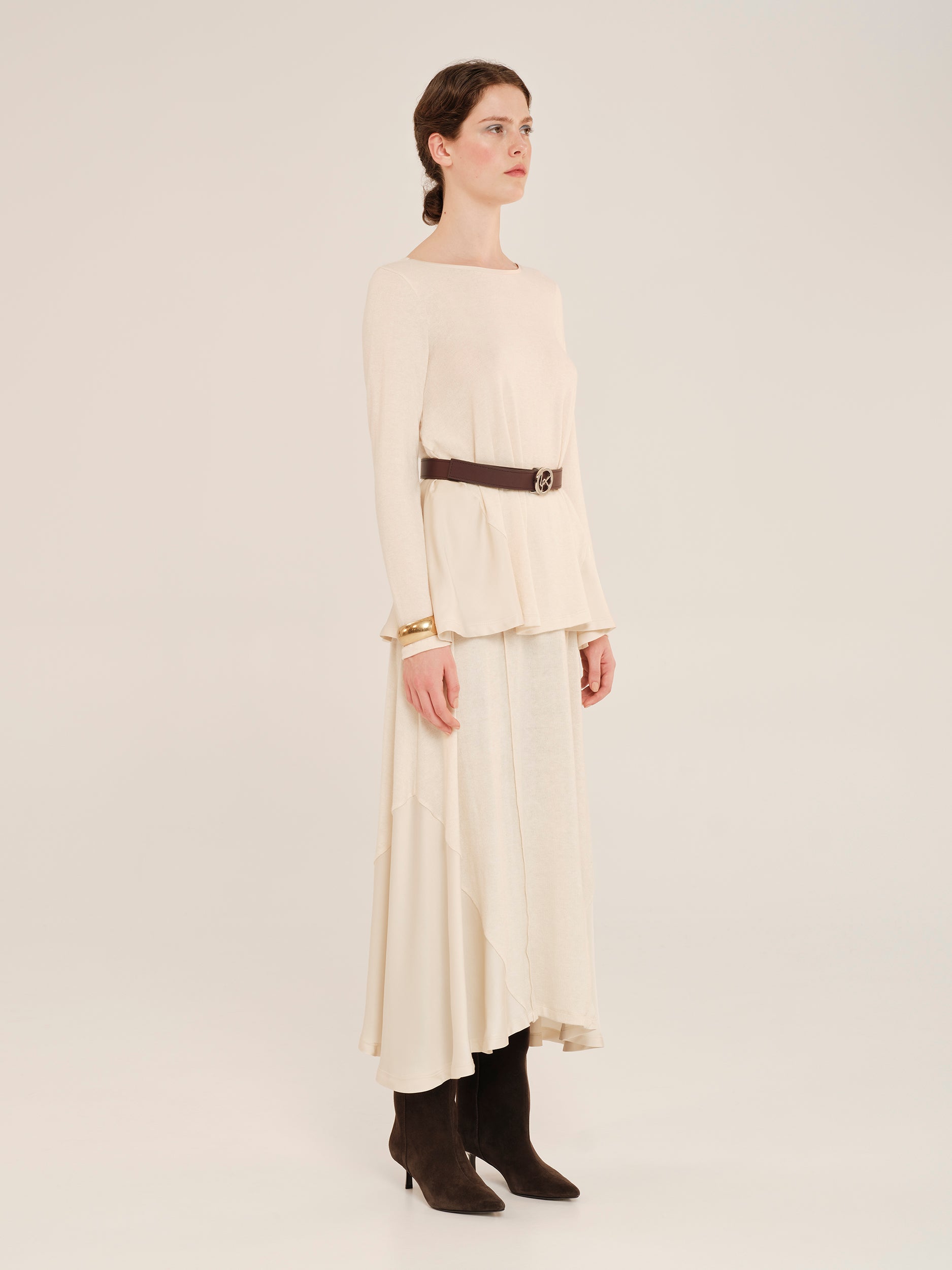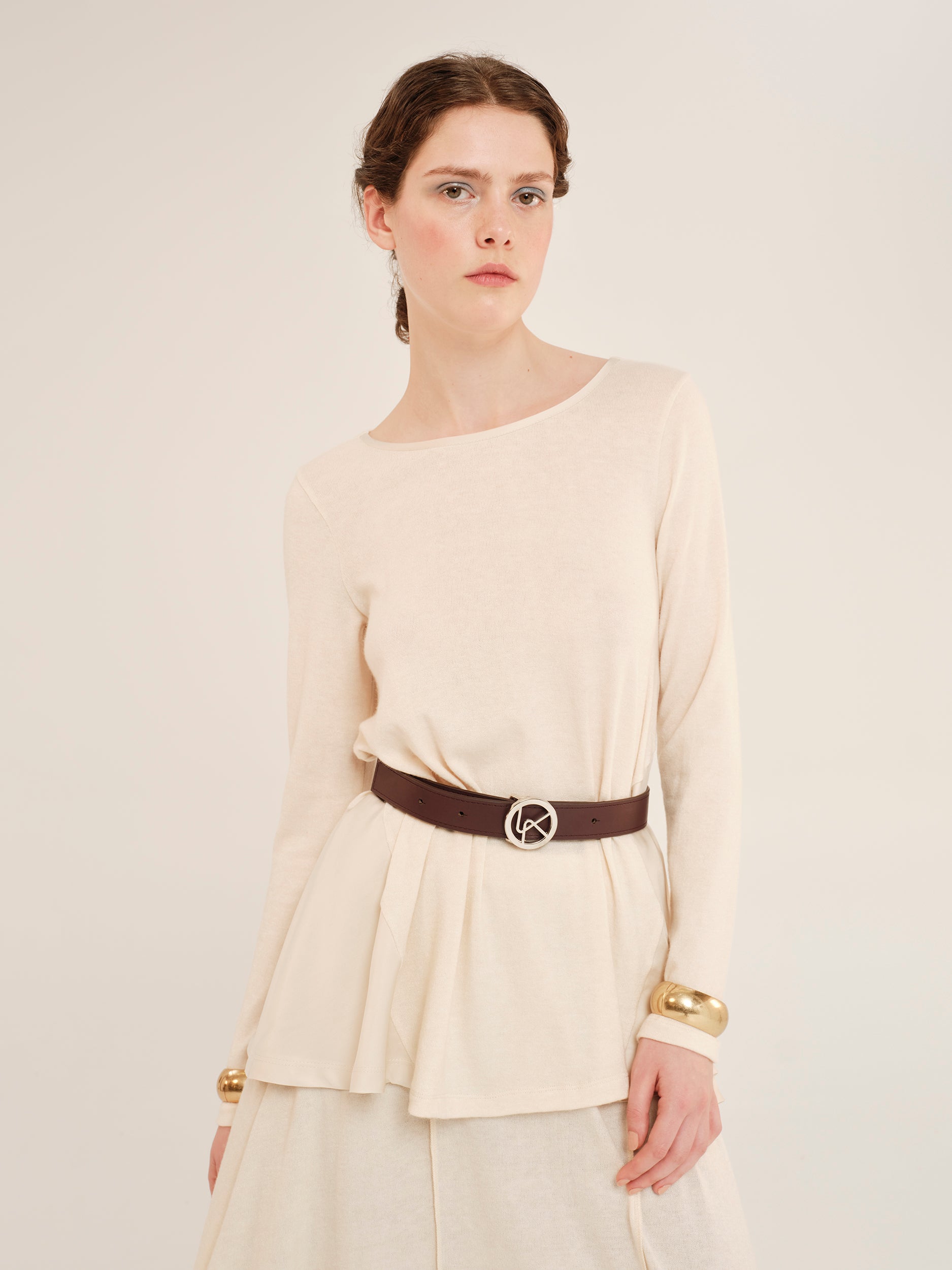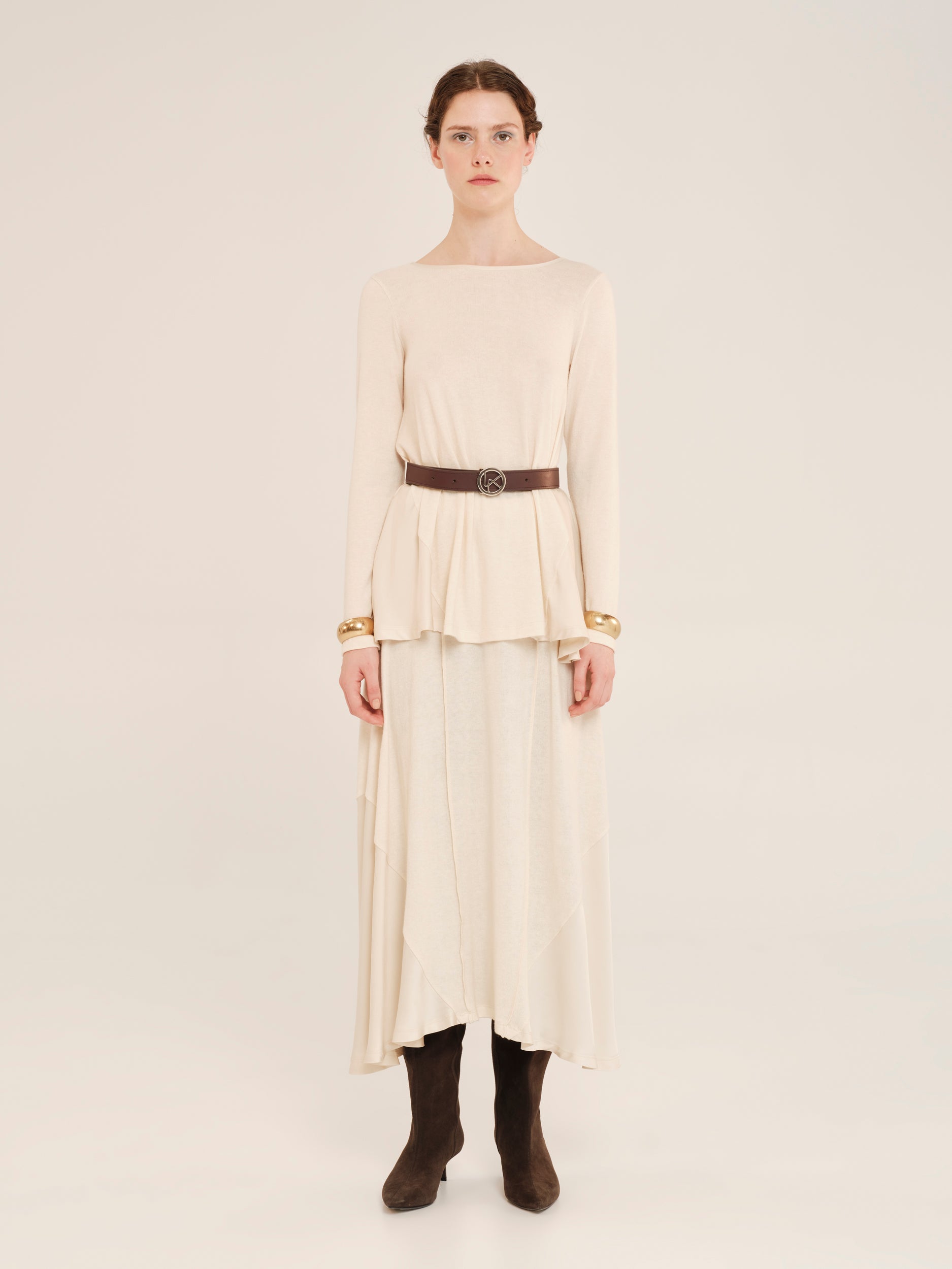 A long-sleeved top crafted from soft, fluffy fabric, featuring elegant satin accents at the hem. Its relaxed fit allows for natural movement, while the flattering neckline enhances the upper body and the sleeves gently embrace the arms. A design that seamlessly unites casual comfort with prêt-à-porter deluxe style — perfect for day-to-night wear.