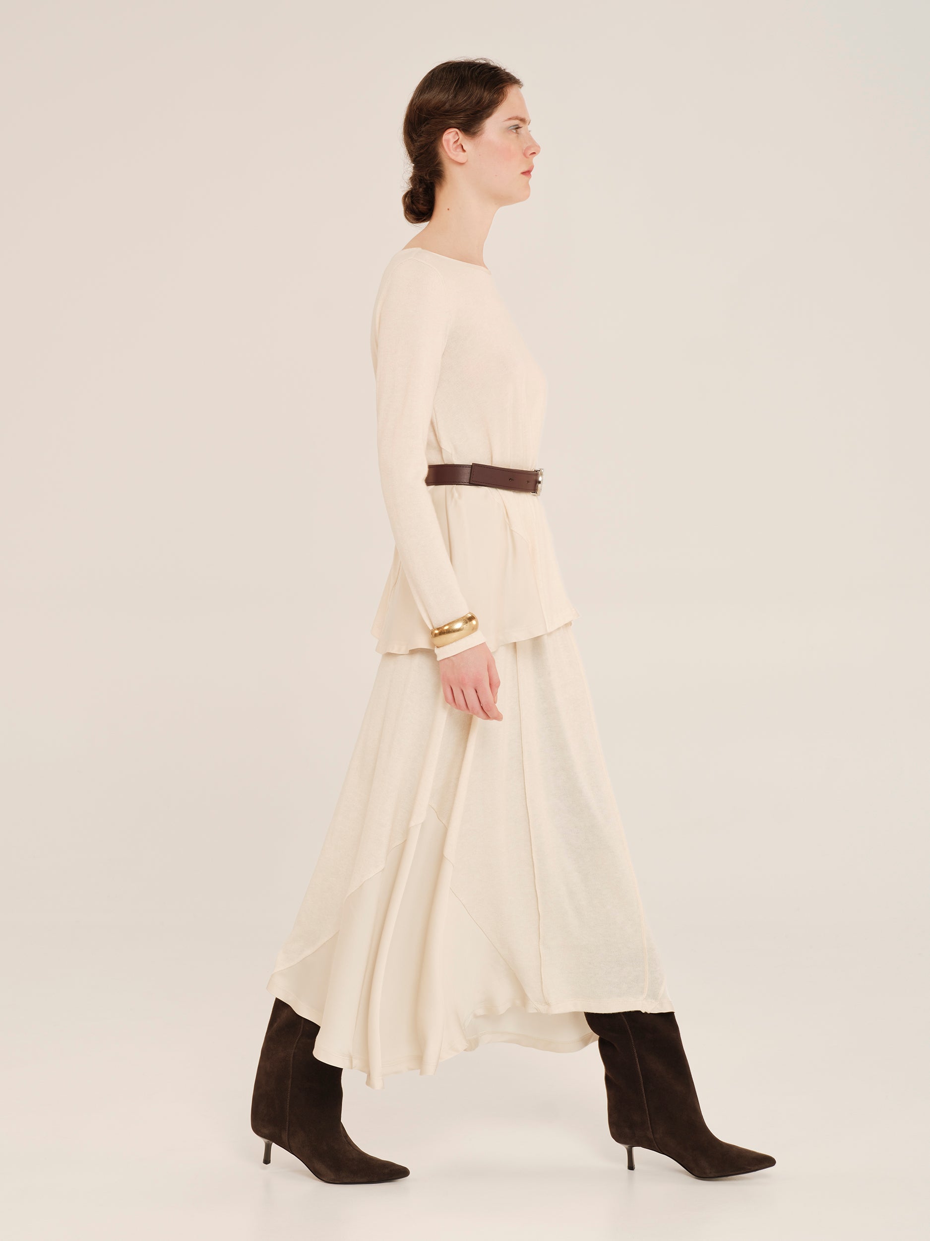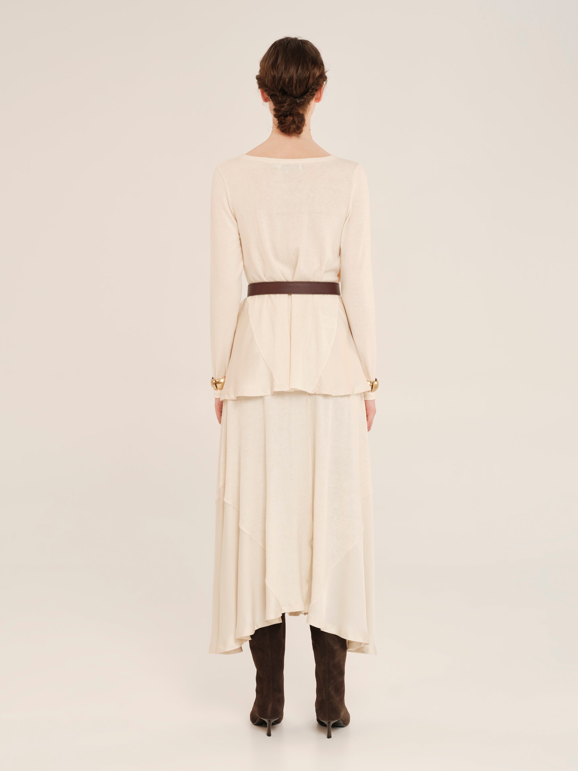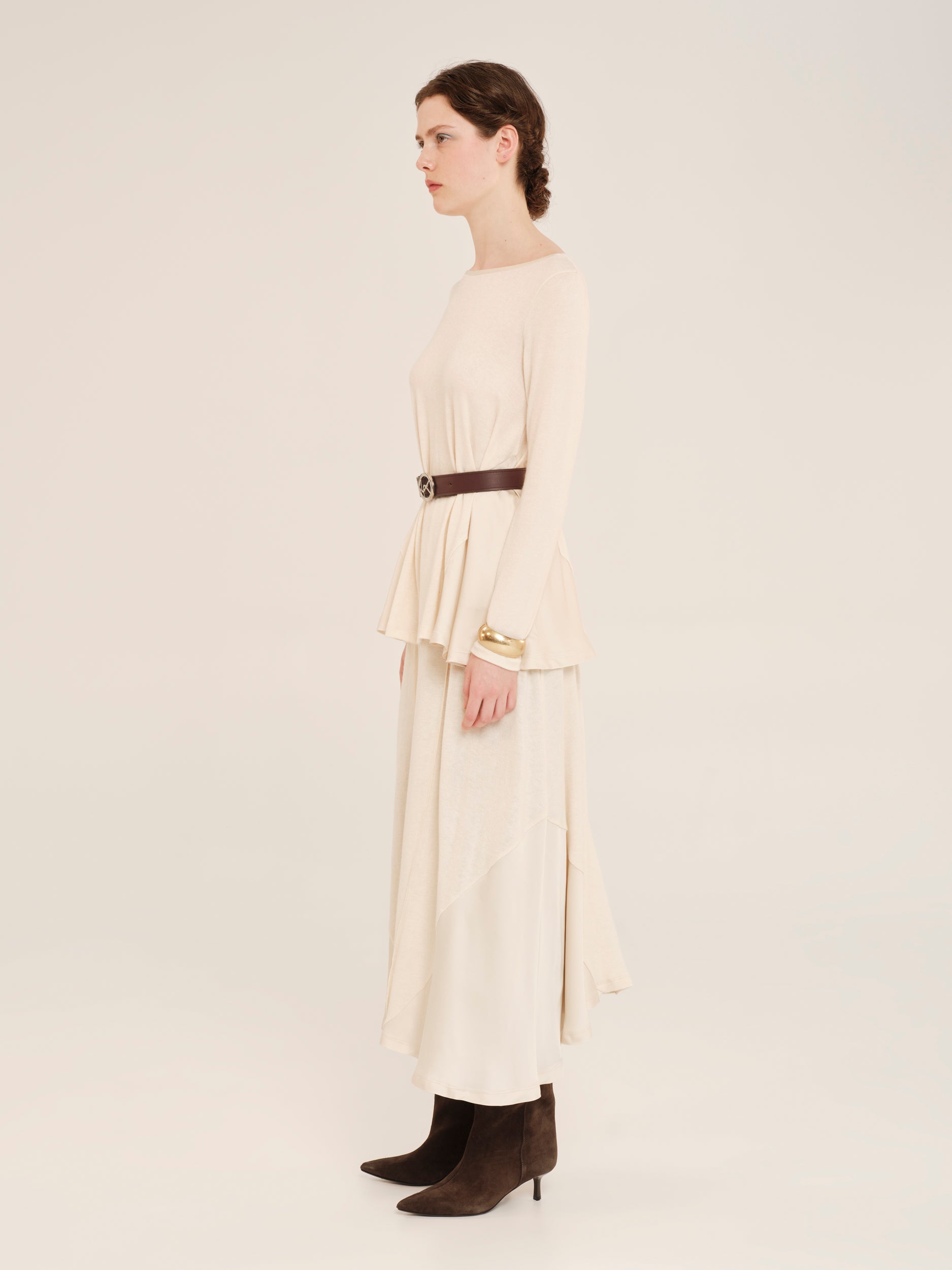 A midi skirt crafted from soft, fluffy fabric, elegantly finished with subtle satin detailing at the hem. The elasticated waistband offers all-day comfort and an easy fit, while the tailored cut allows for graceful, flowing movement. A truly feminine and refined design that strikes the perfect balance between casual chic and prêt-à-porter deluxe style.