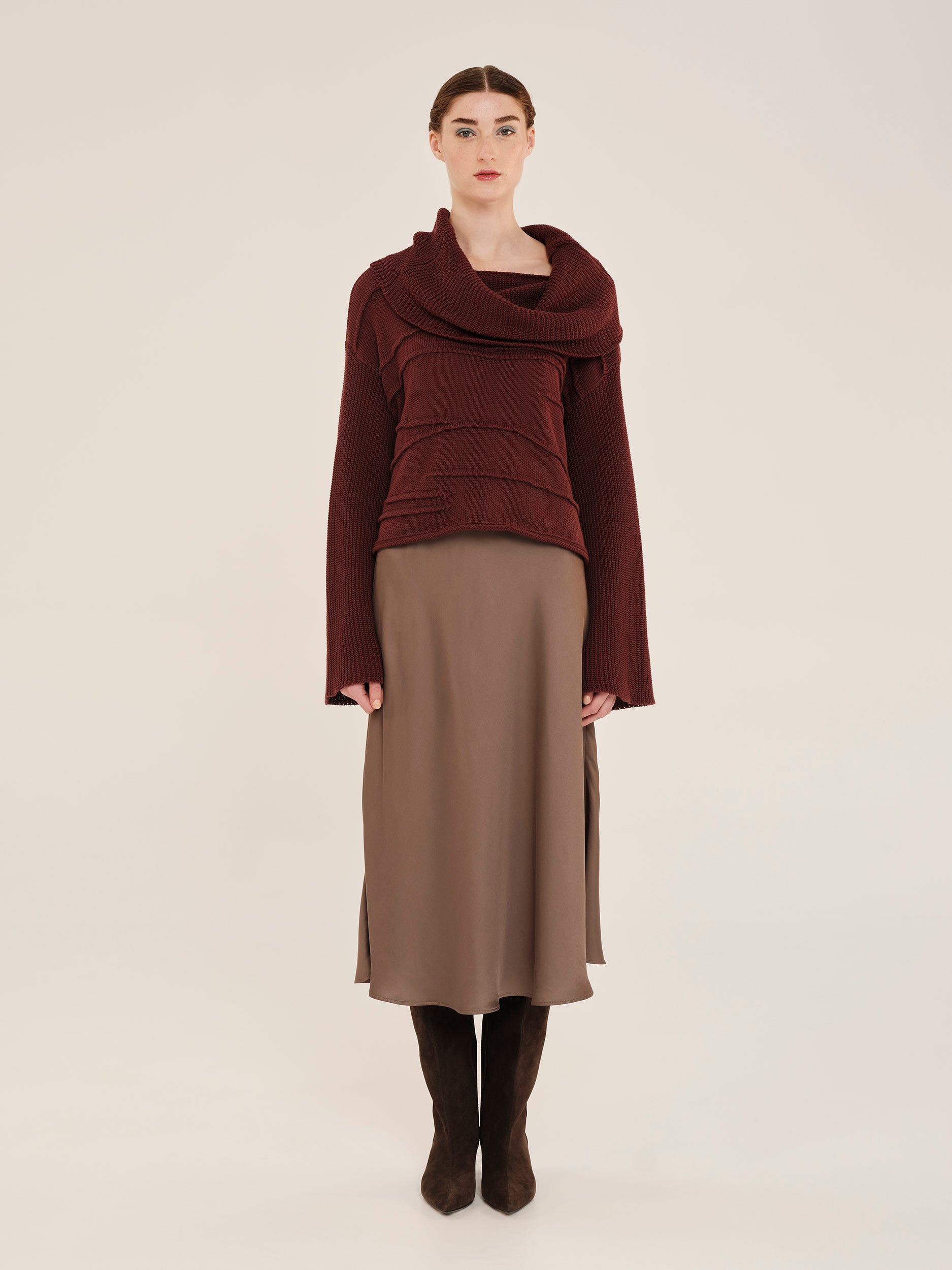 Knitted long-sleeve blouse made from 100% Greek cotton. It features a relaxed, oversized fit with long, wide sleeves and a loose high neckline. Its textured knit with irregular nervures adds a distinct character, showcasing the complexity of its design and craftsmanship. It pairs effortlessly with the collection’s bottoms for cool, laid-back everyday looks.