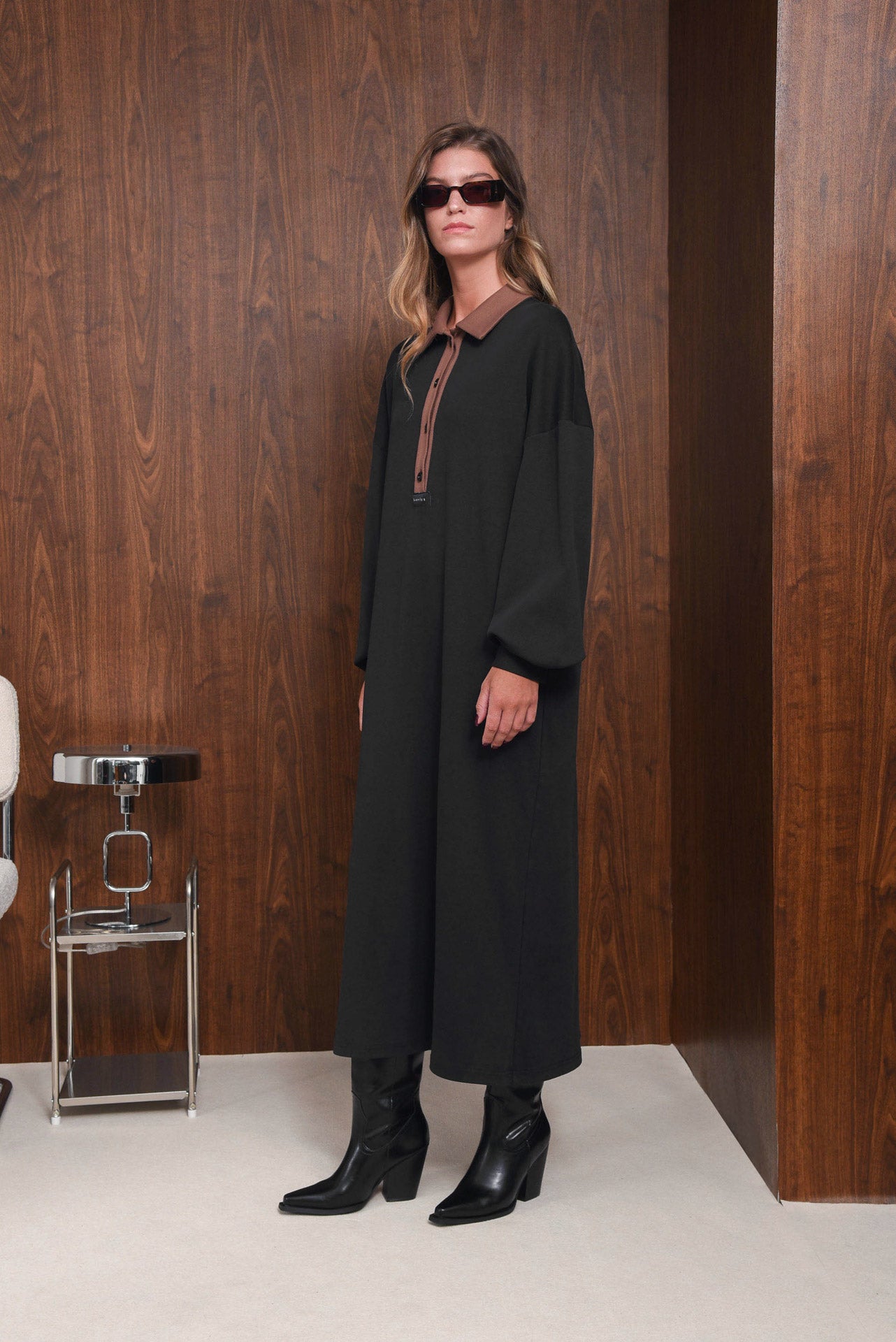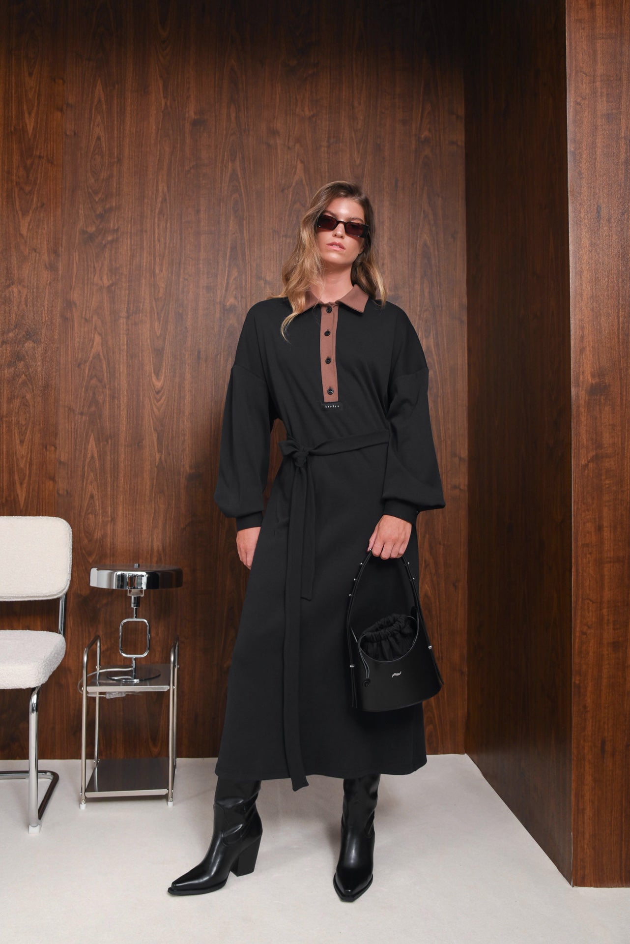 The Real Dress combines comfort with sophistication. Cut in a midi length with a relaxed fit, defines the silhouette with its waist tie. The polo details complete this easy, everyday look.