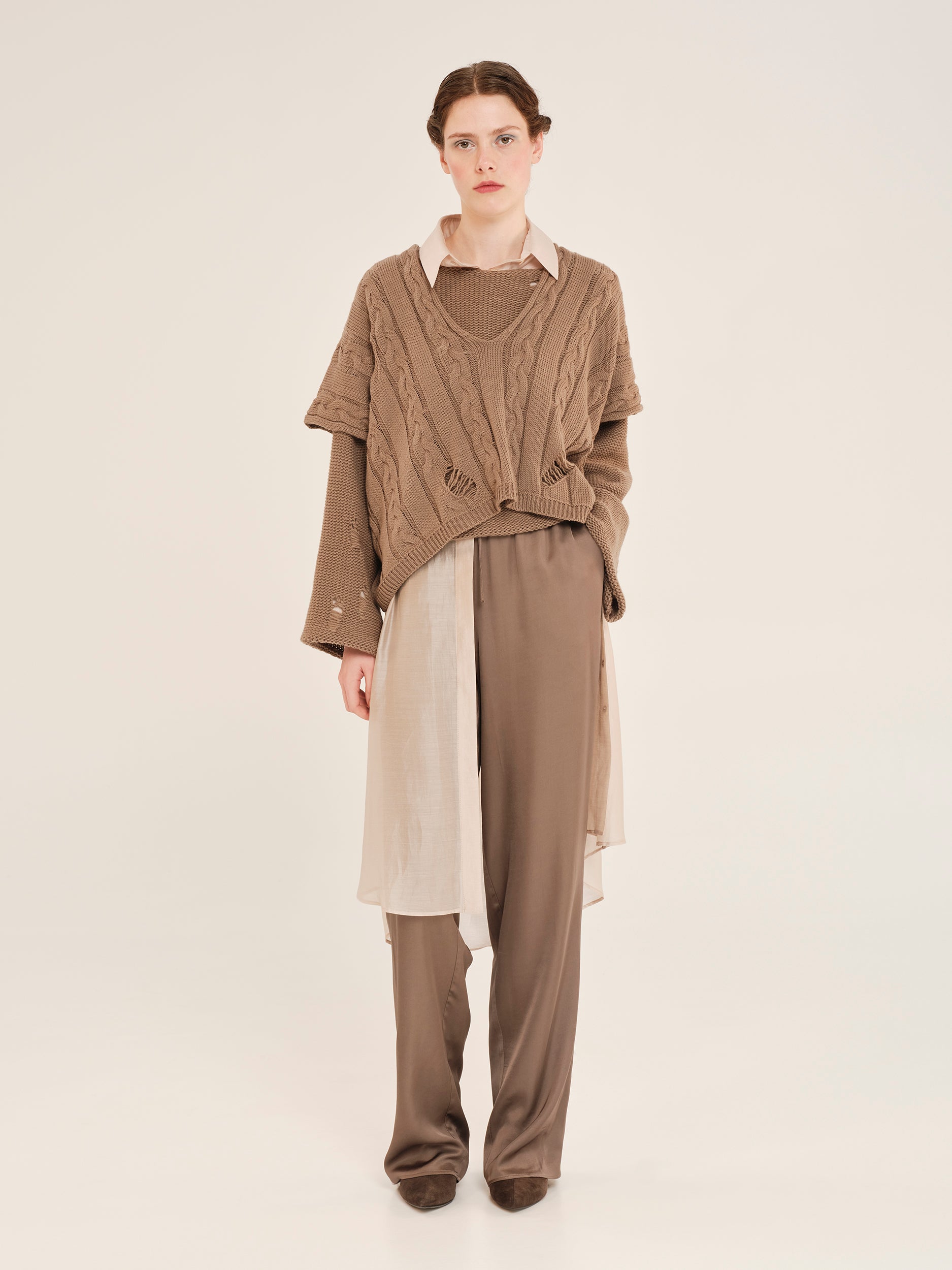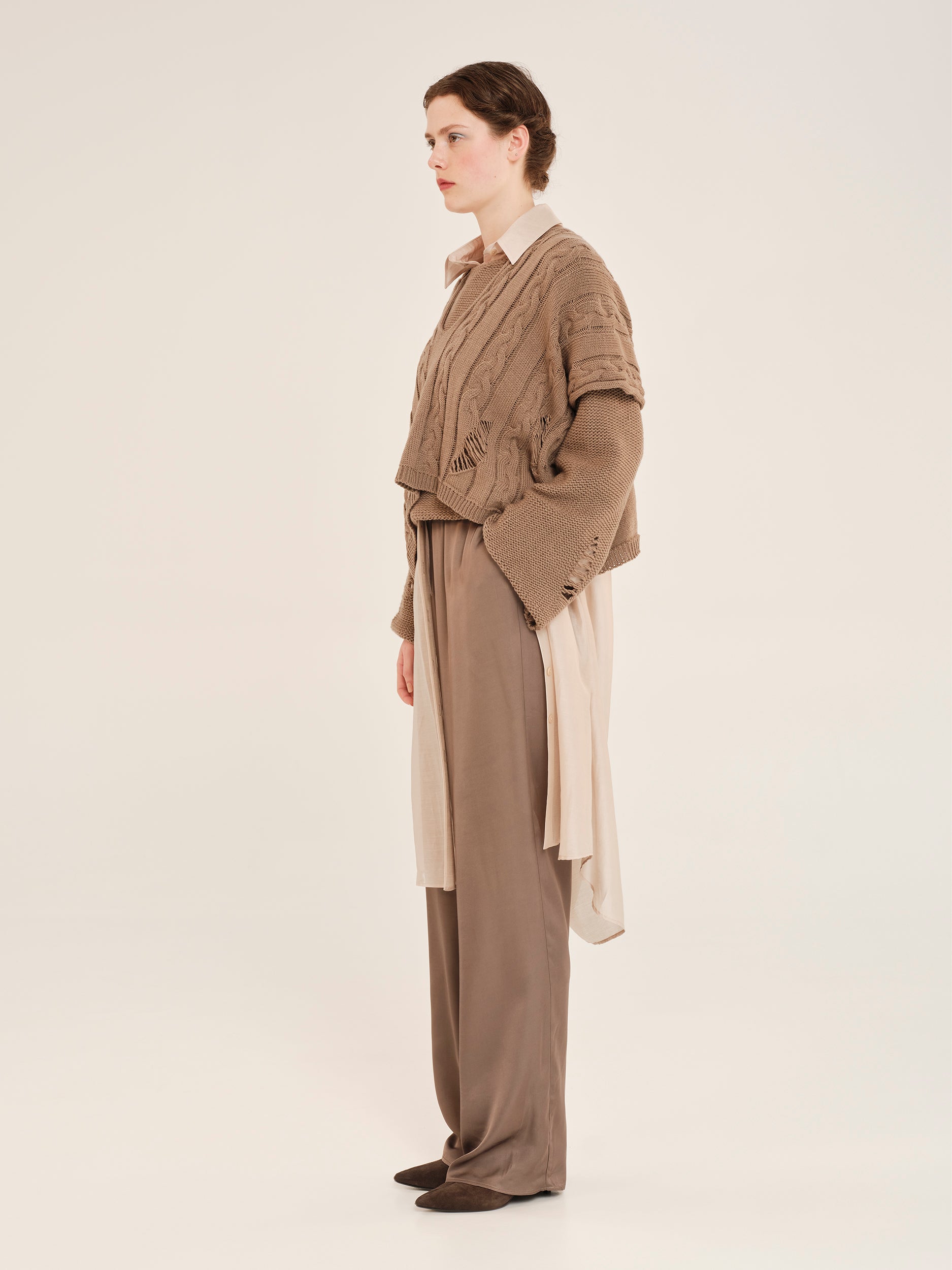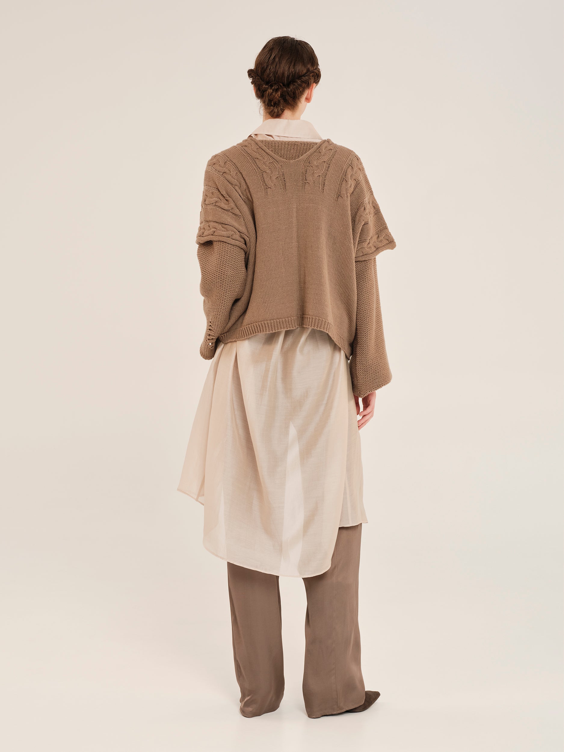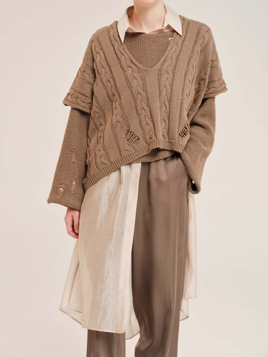 Knitted vest made from a wool blend, featuring a soft, cozy texture and timeless cable knit pattern. It has relaxed shoulders that gently cover the upper arms and a front V-neckline.