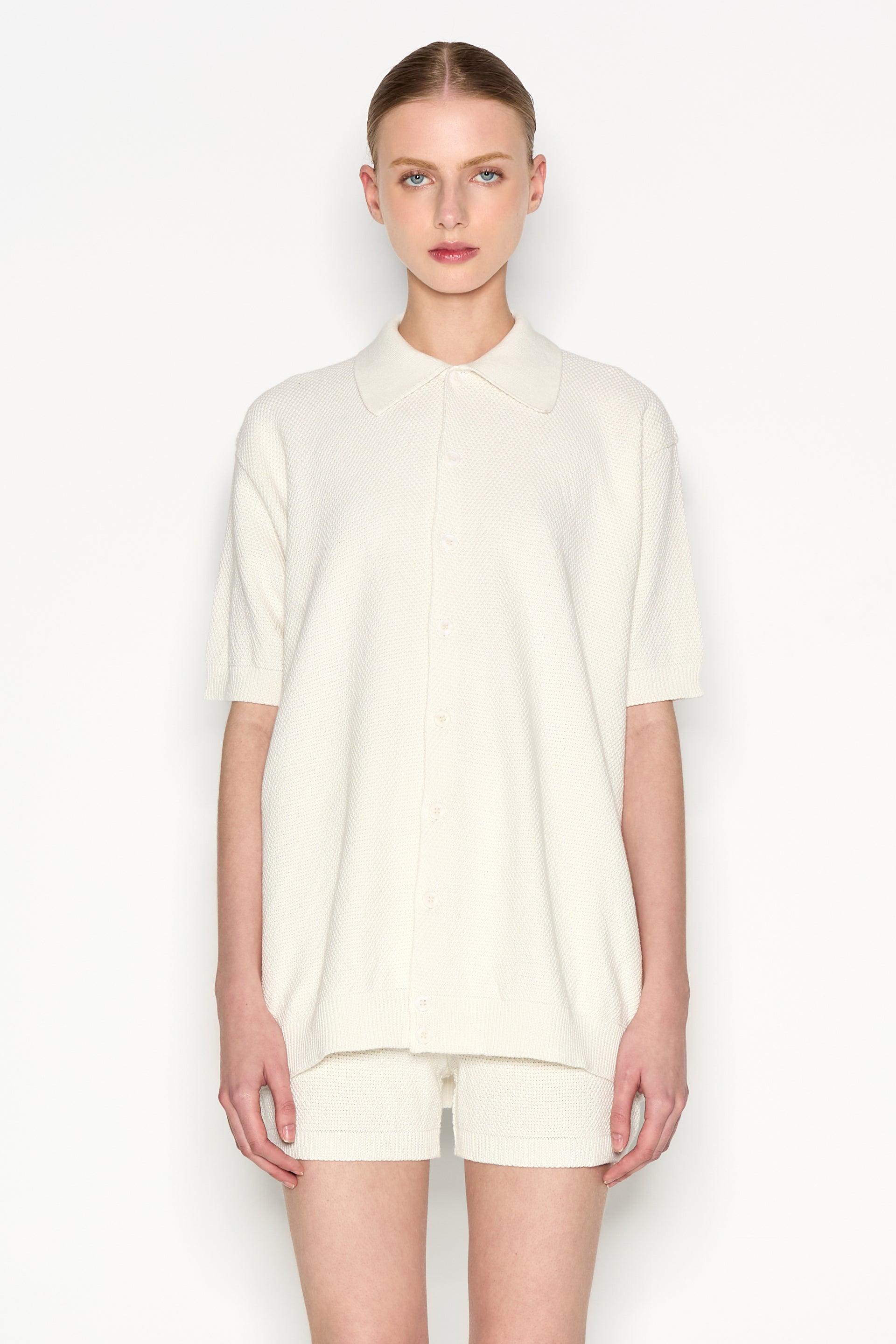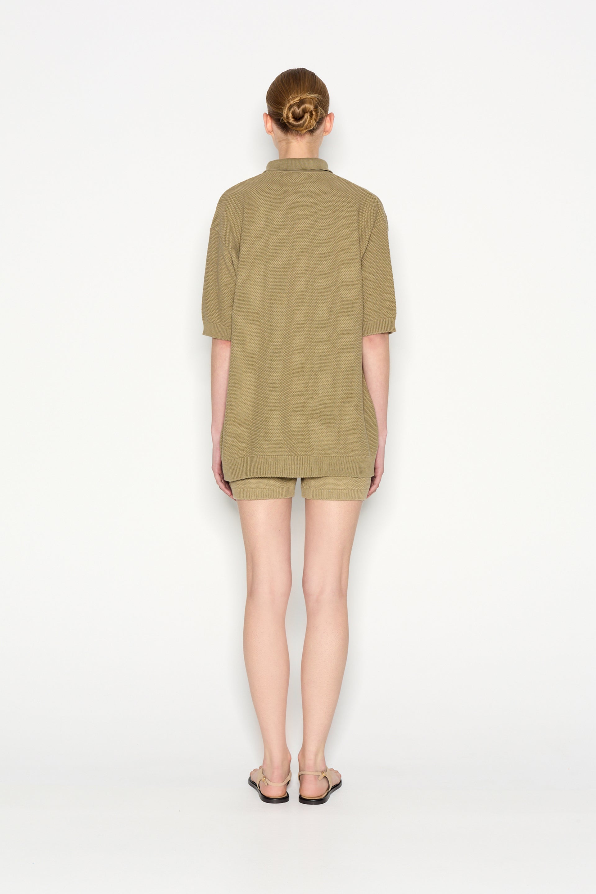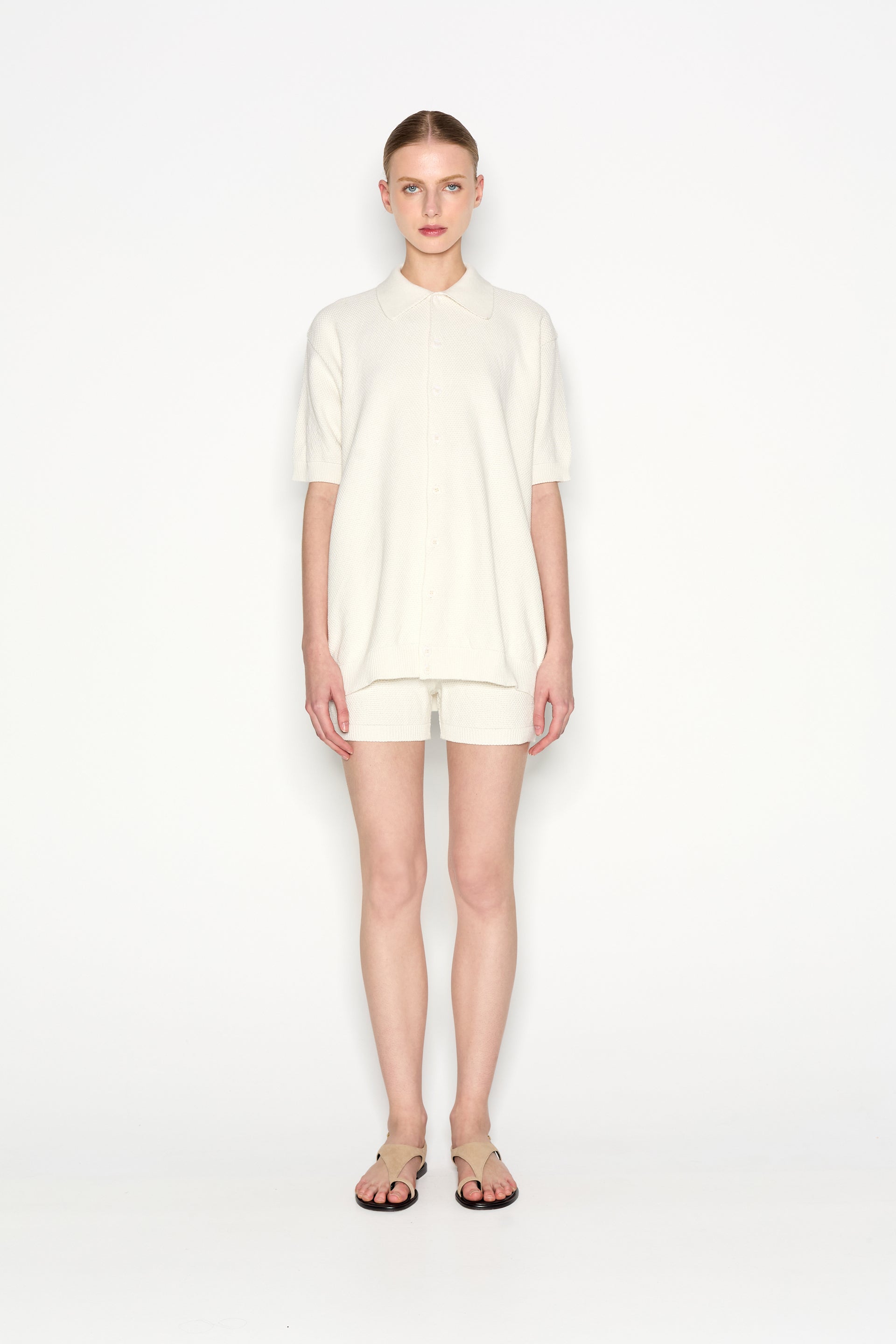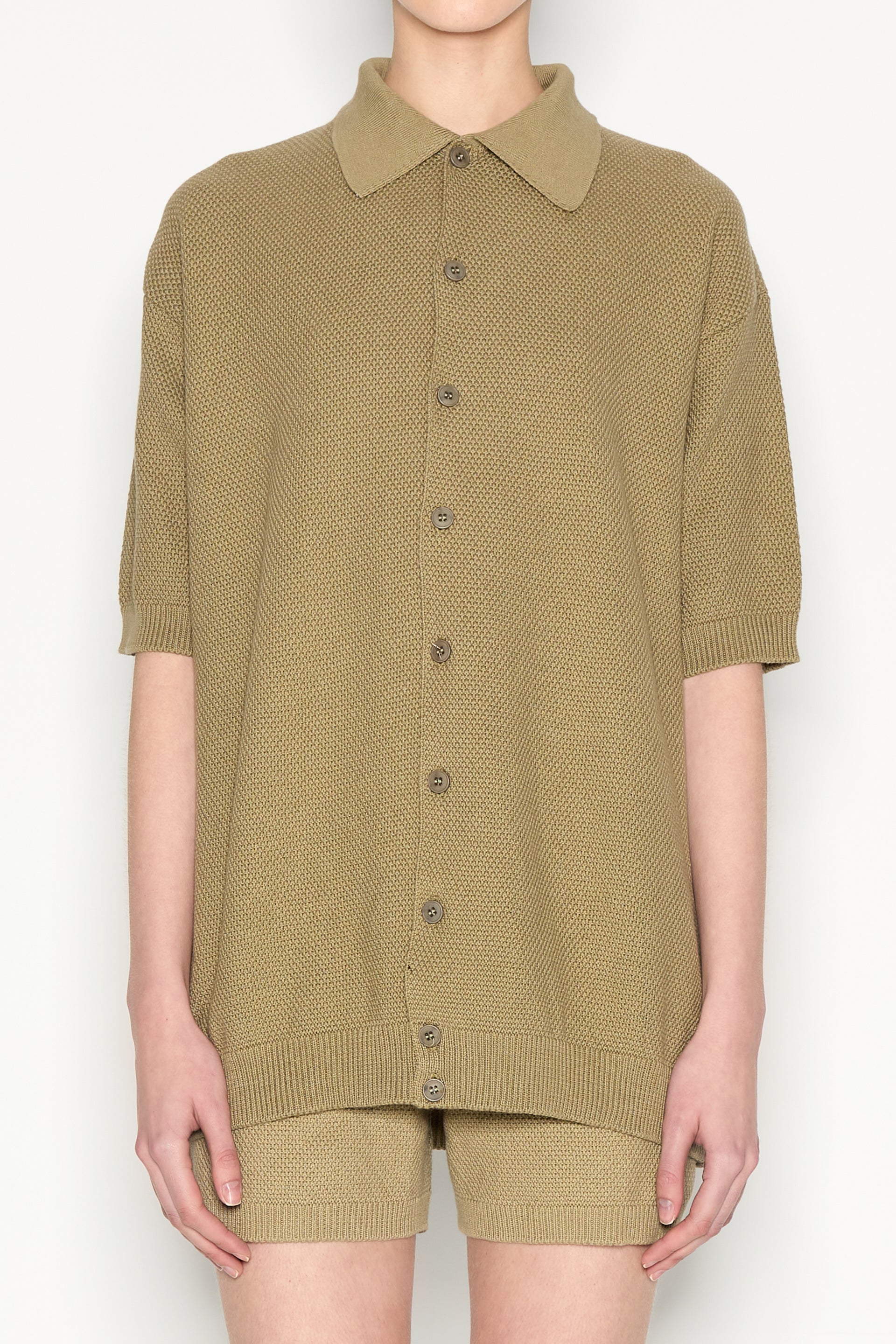 The Sunflare Knitted Shirt has a laid-back fit and a breathable knit feel, making it perfect for summer. With its soft collar, button-down front, and short sleeves, it’s easy to layer or wear on its own. Available in ecru and khaki, this shirt mixes comfort with simple style and works for both men and women.